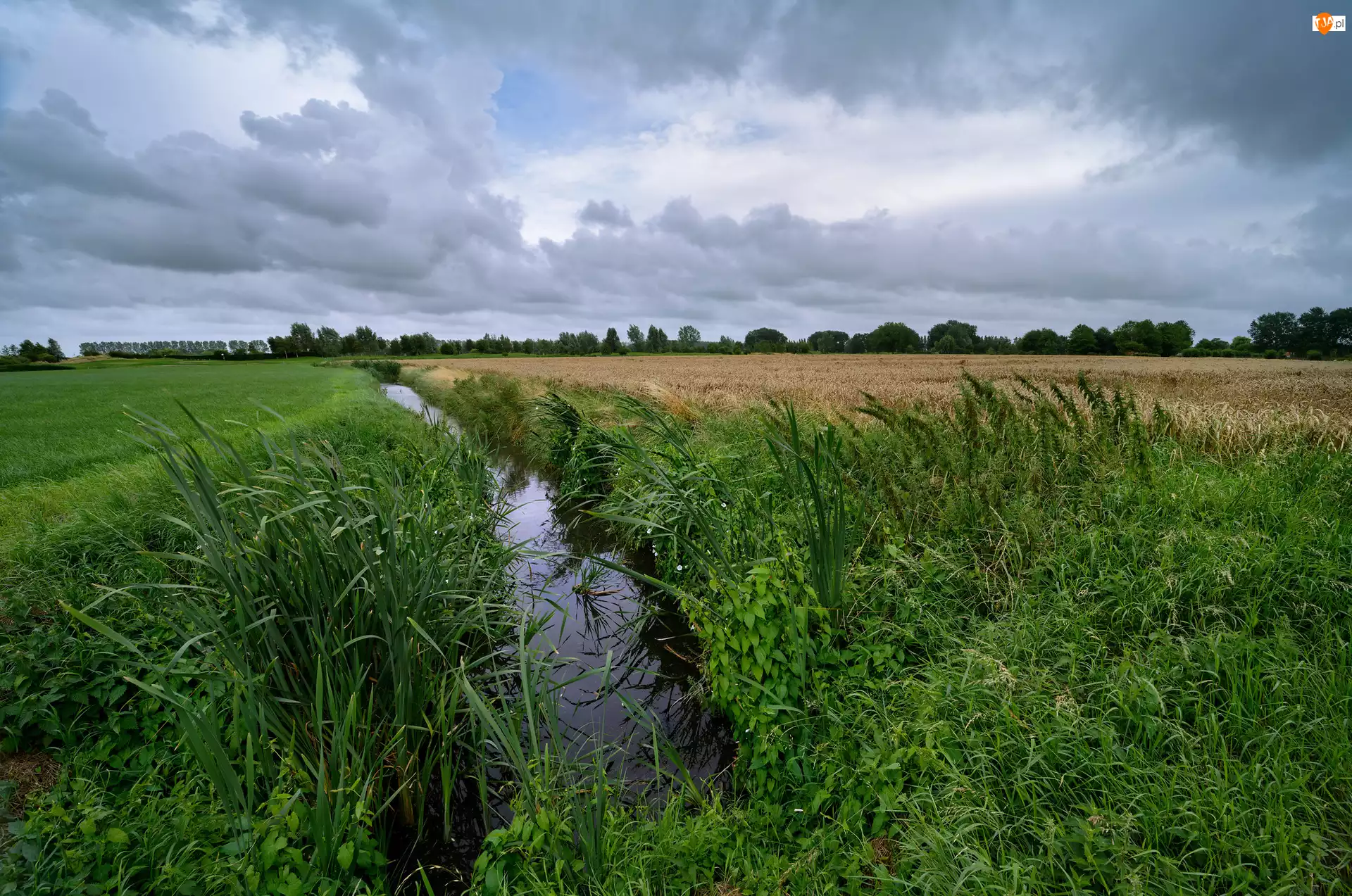 Łąka, Rów, Pole, Drzewa, Trawa, Zboże