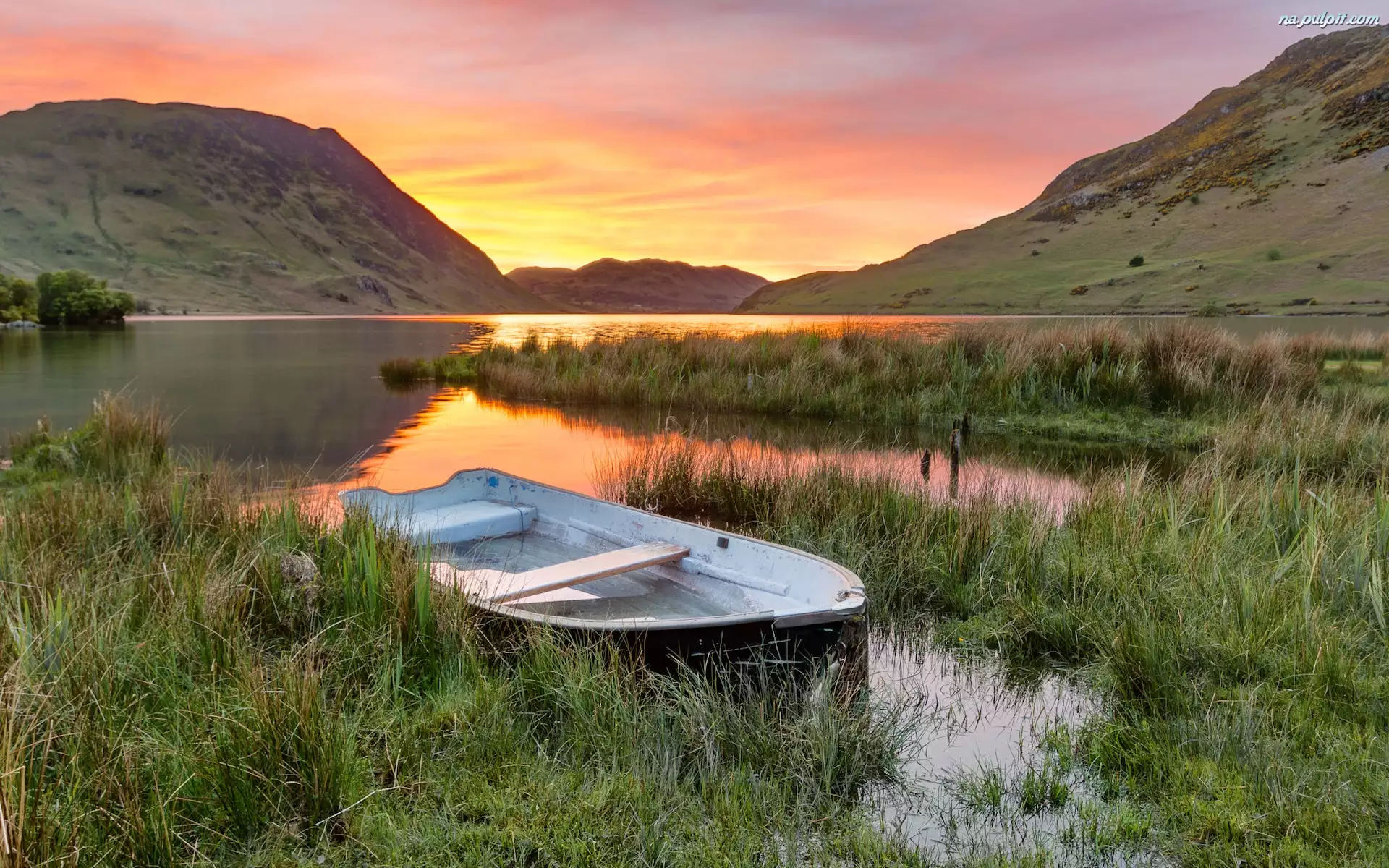 Łódka w szuwarach na brzegu jeziora Crummock pod