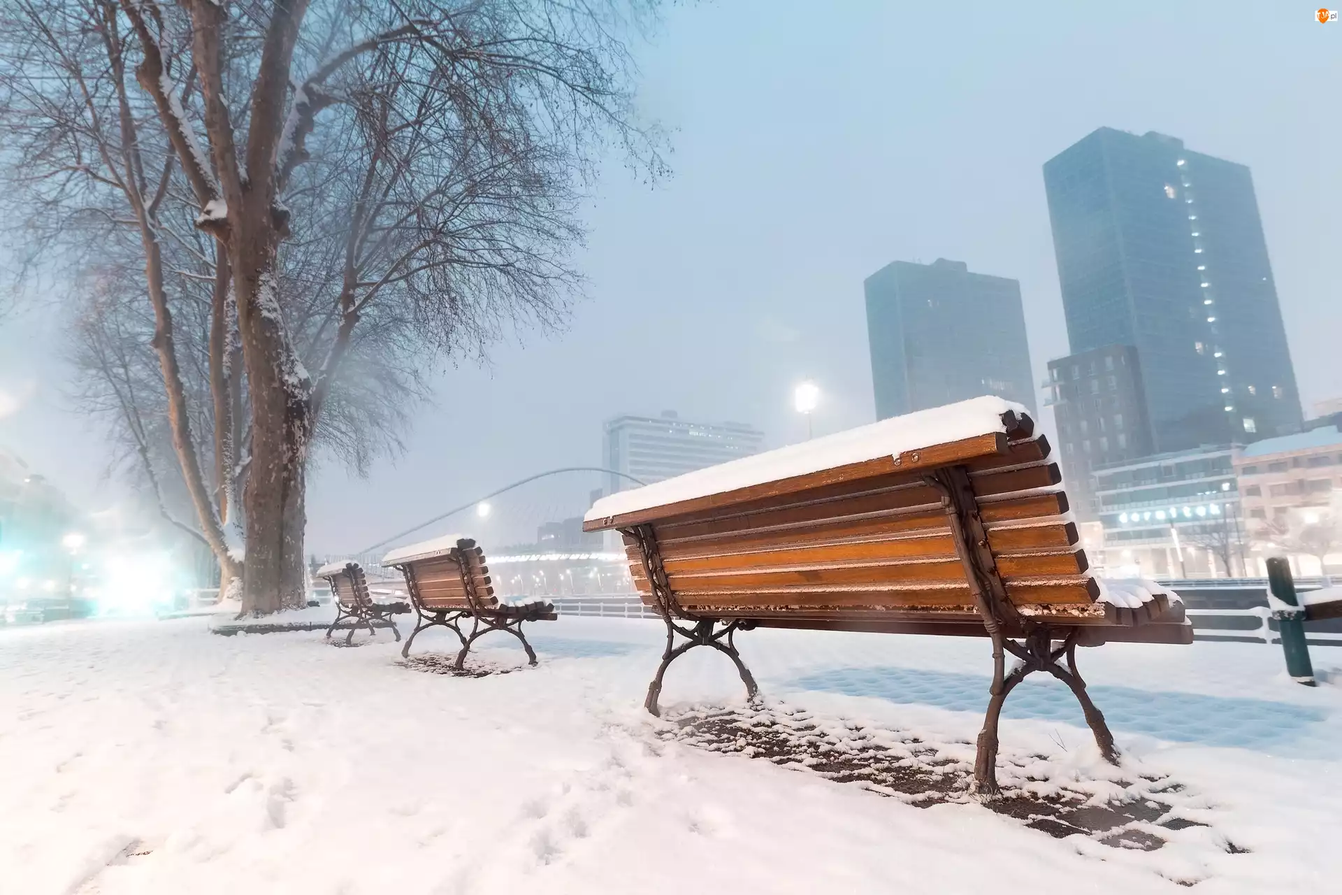 Ławki, Zima, Drzewa, Śnieg, Domy
