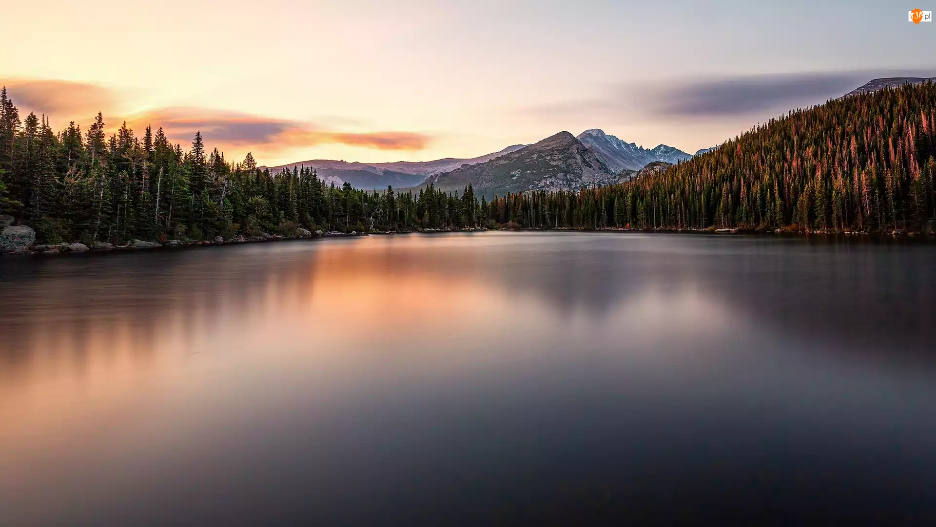 Drzewa, Świerki, Stany Zjednoczone, Góry, Stan Kolorado, Park Narodowy Gór Skalistych, Jezioro Bear Lake