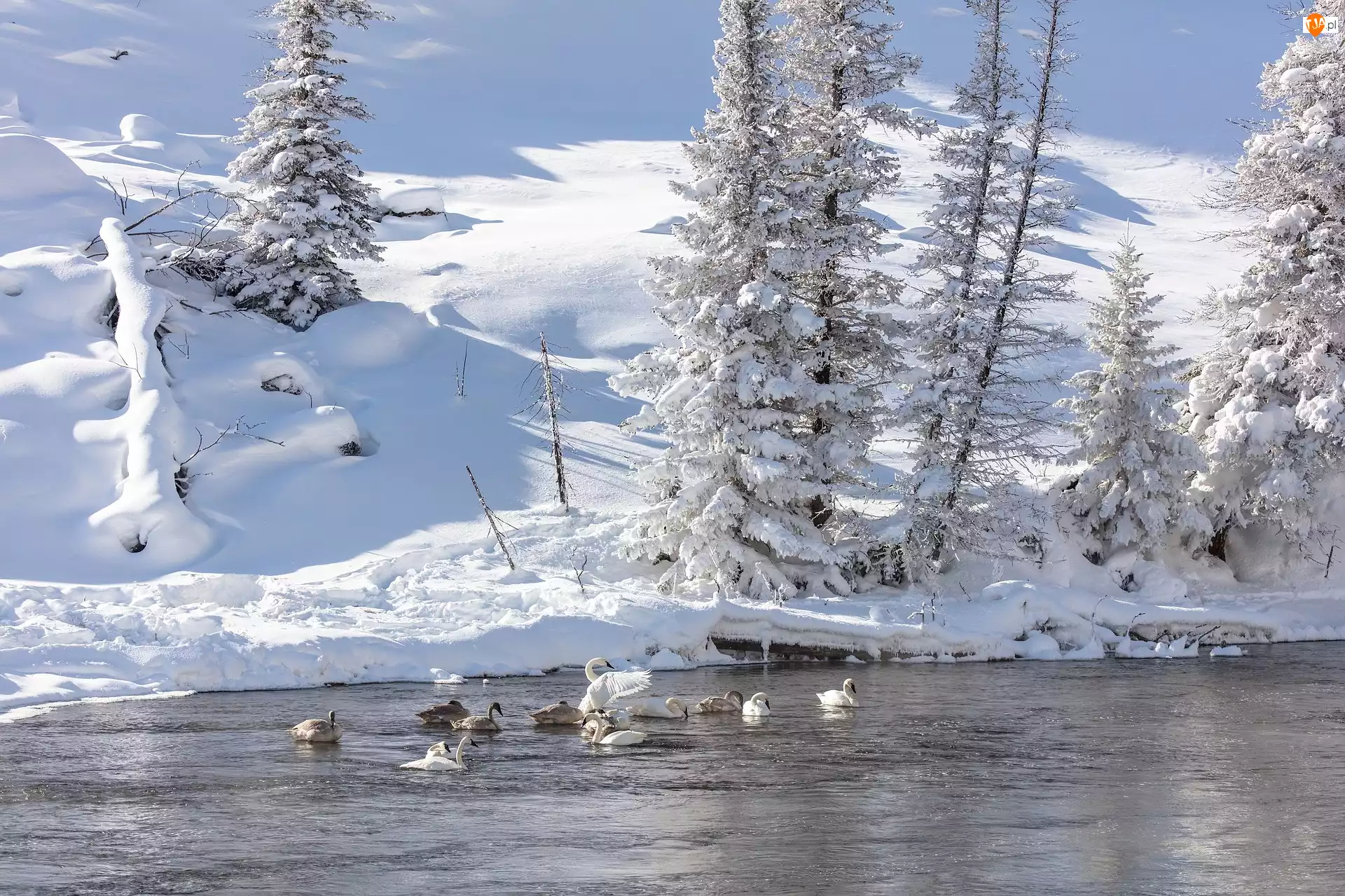 Łabędź trębacz, Stany Zjednoczone, Rzeka Madison, Zima, Stan Wyoming, Łabędzie, Drzewa, Park Narodowy Yellowstone