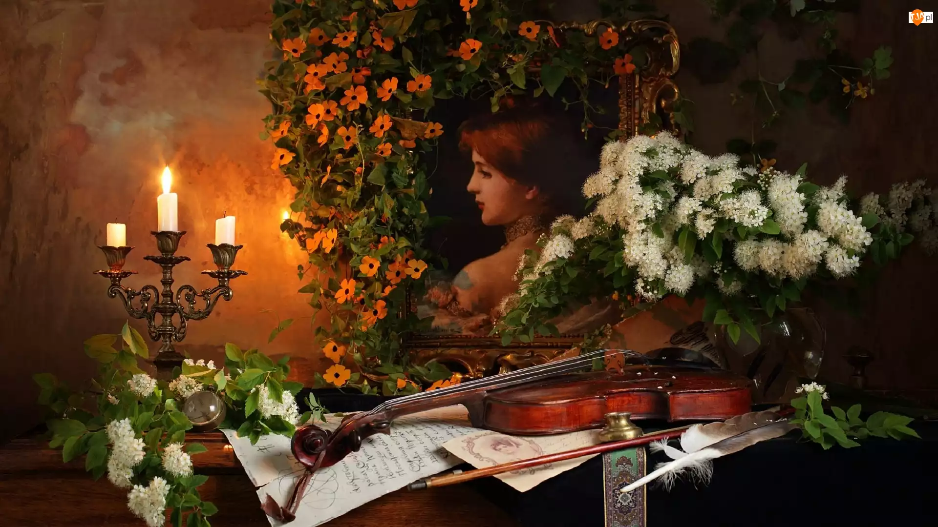 Portret, Wazon, Świece, Kompozycja, Nuty, Skrzypce, Świecznik