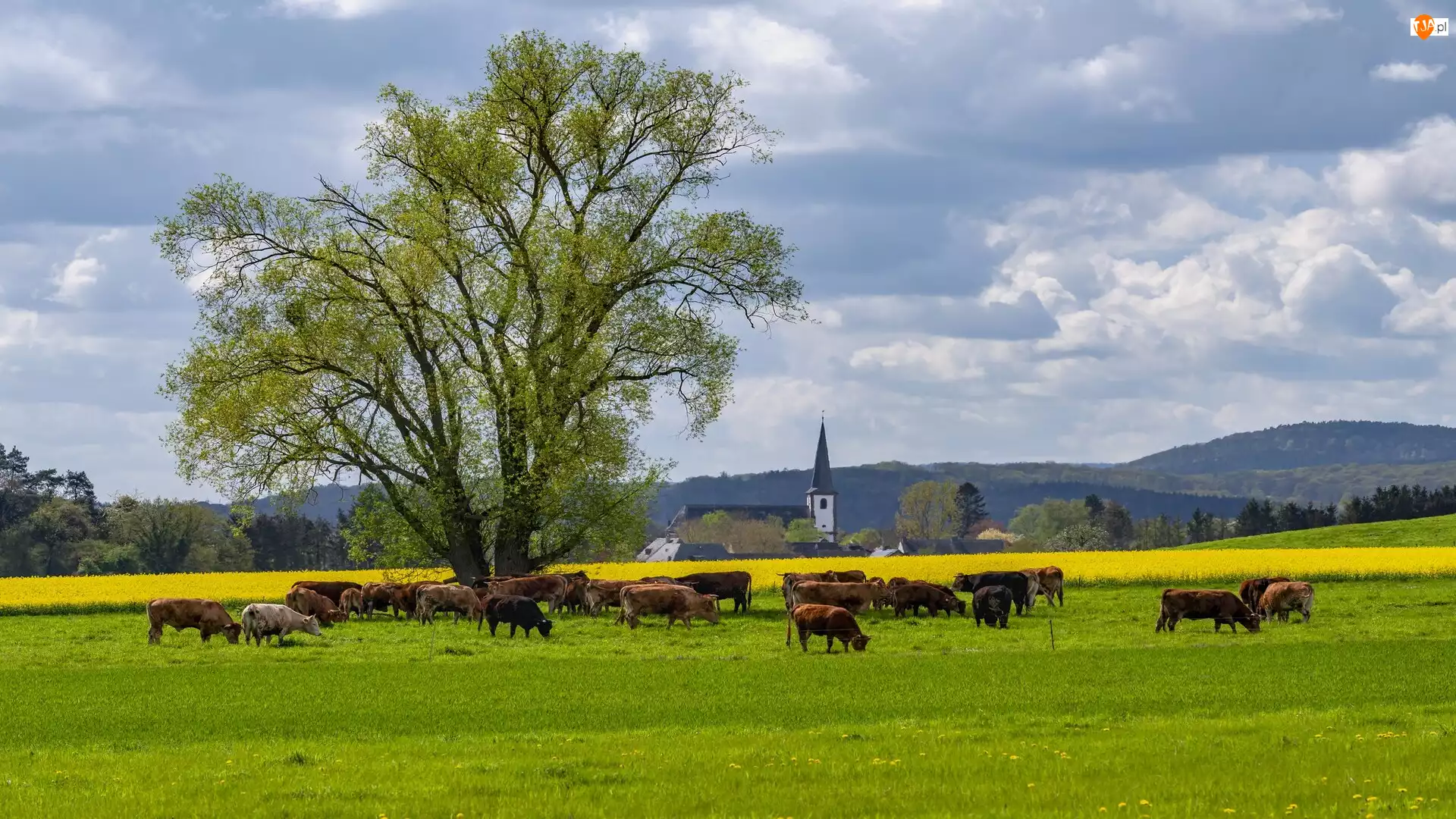 Łąka, Drzewo, Kościół, Niemcy, Krowy, Dolina