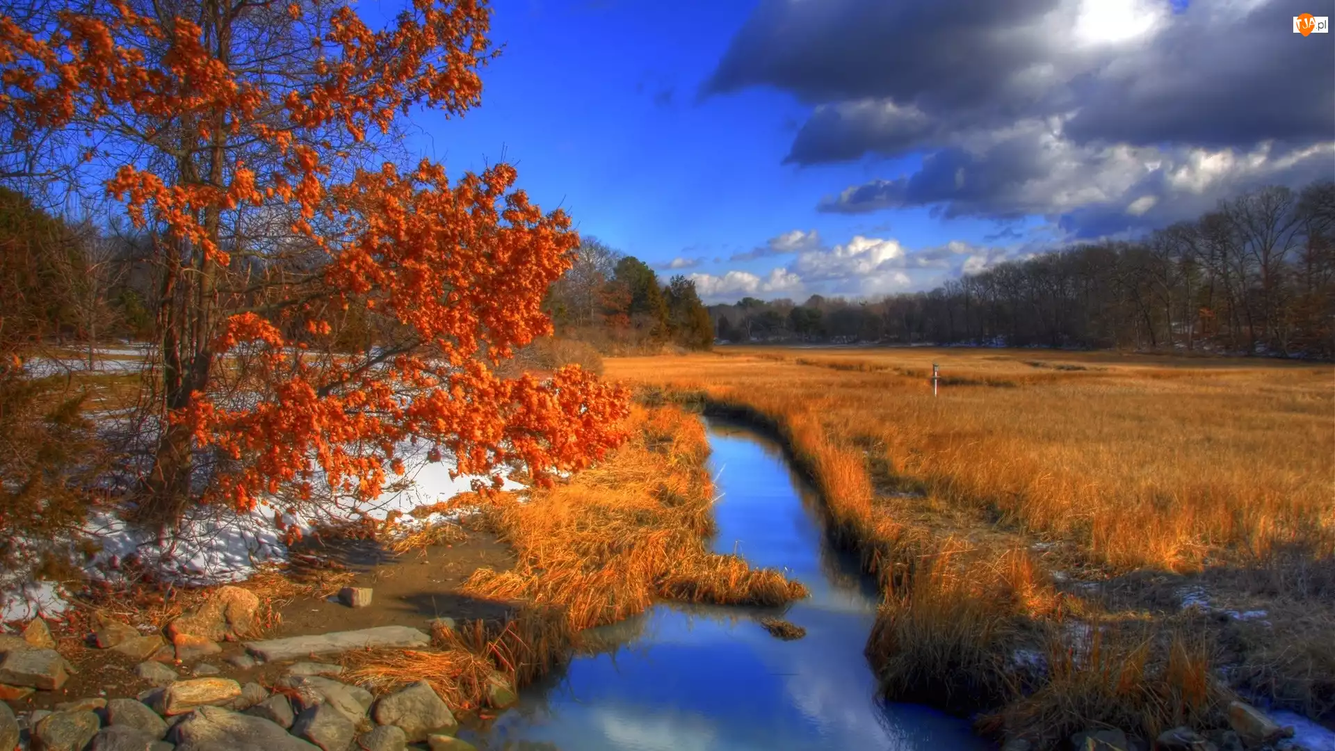 Łąka, Las, Jesień, Drzewo, Rzeka, Trawa