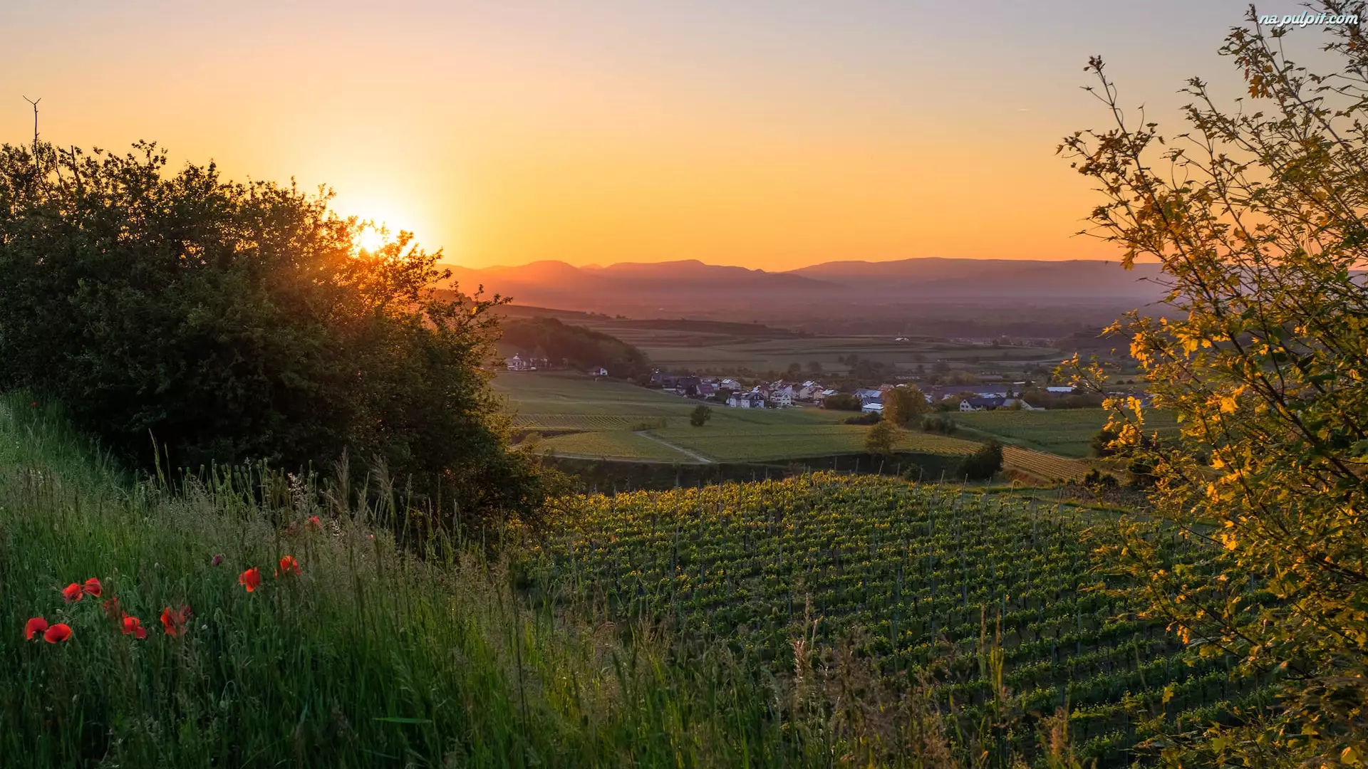 Łąka, Maki, Niemcy, Wschód słońca, Kaiserstuhl, Winnice, Krzewy