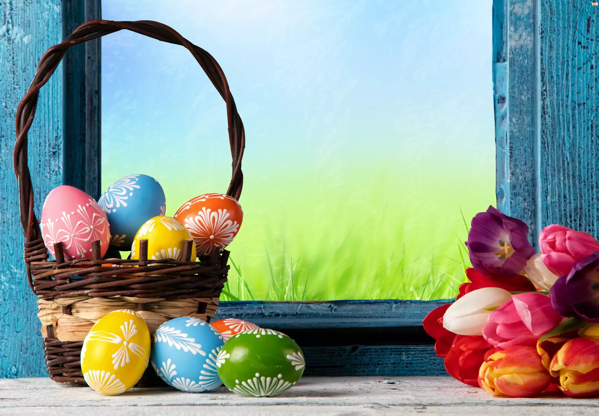 Łąka, Okno, Koszyk, Pisanki, Wielkanoc, Tulipany