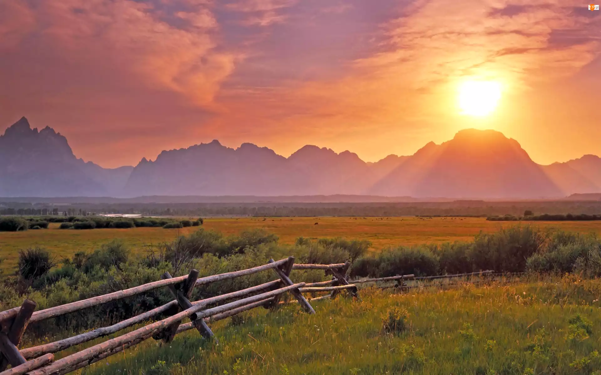 Łąka, Zachód Słońca, Płotek, Góry