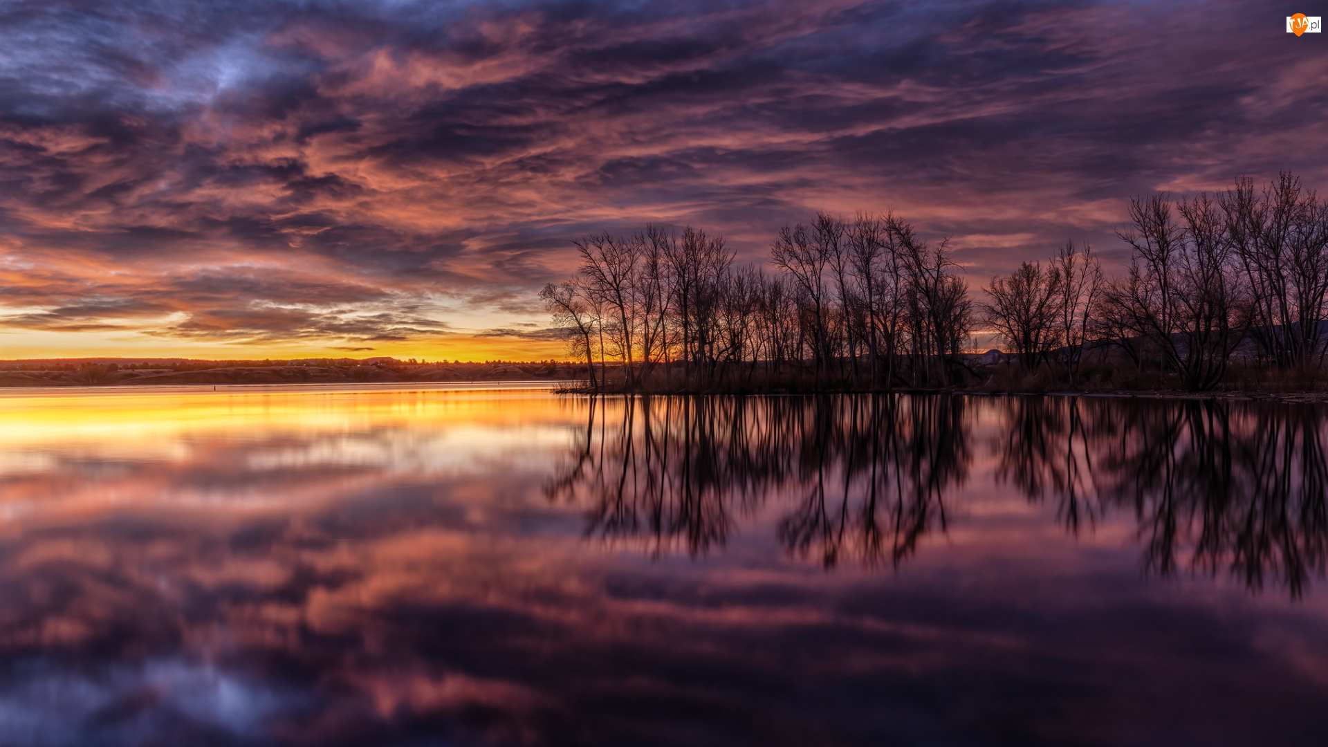 Lake Chatfield, Jezioro, Drzewa, Stany Zjednoczone, Wschód słońca, Kolorado