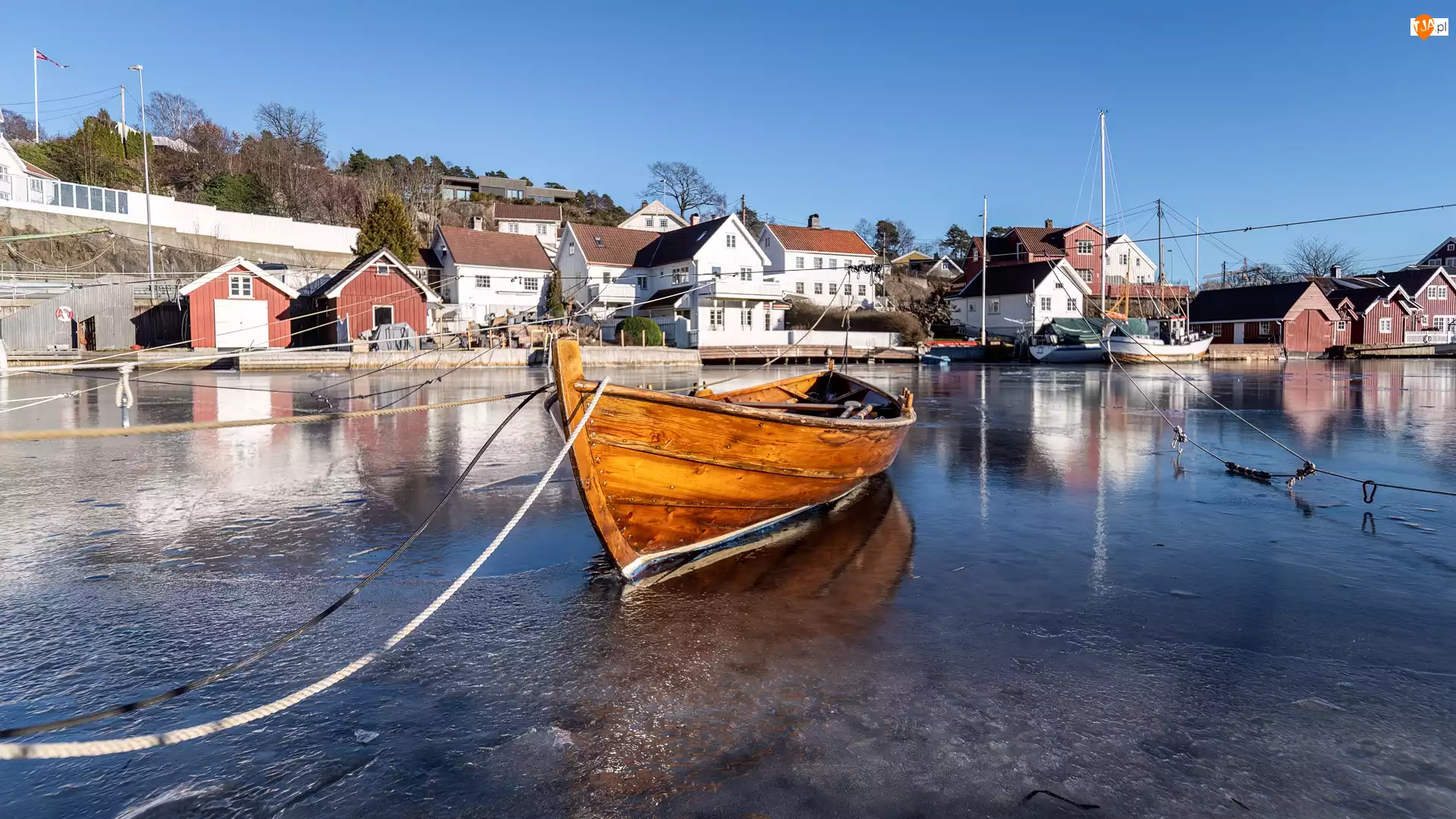 Lód, Domy, Łódka, Jezioro