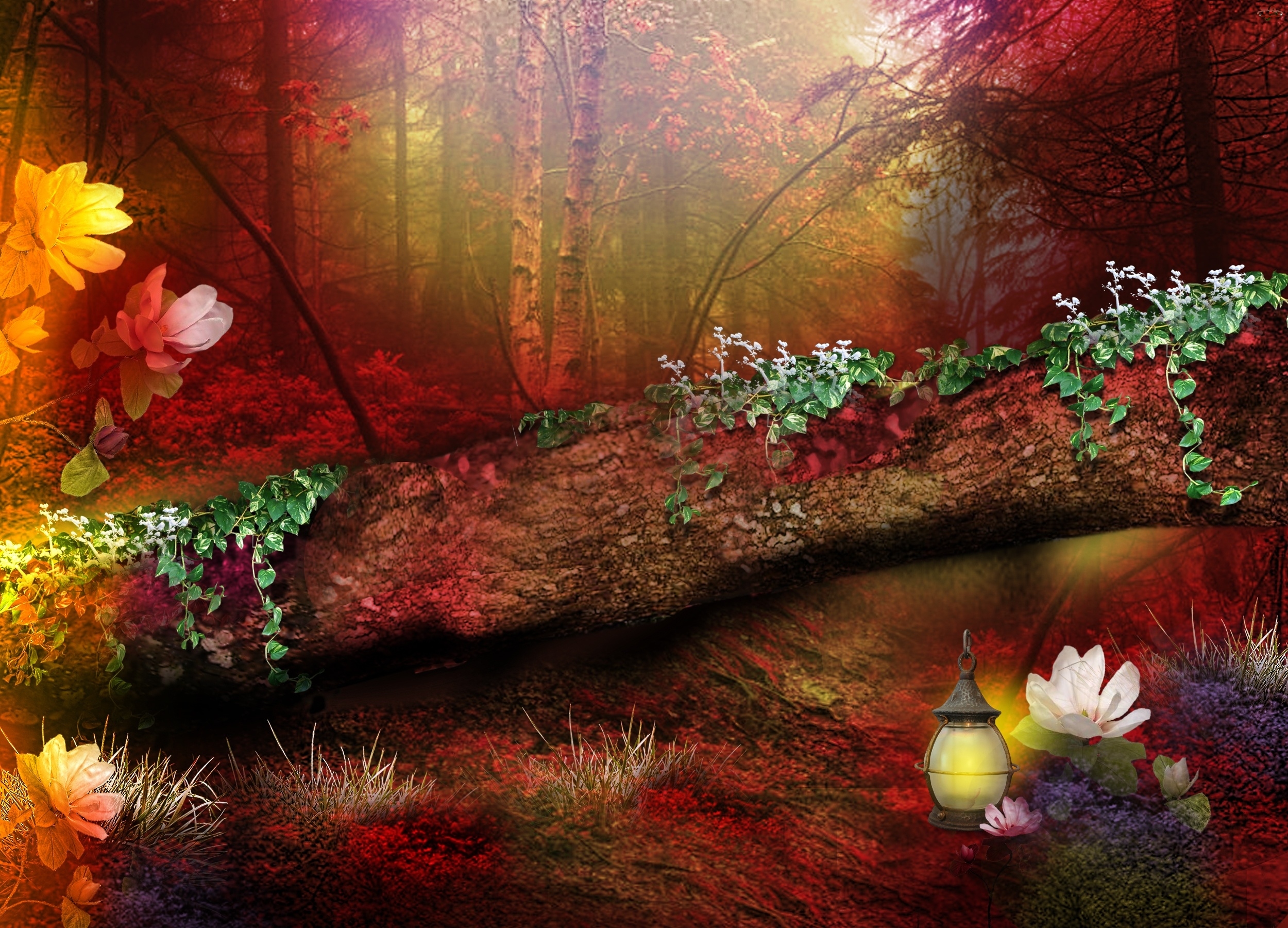 Lampa, Las, Pień, Kwiaty, Drzewa
