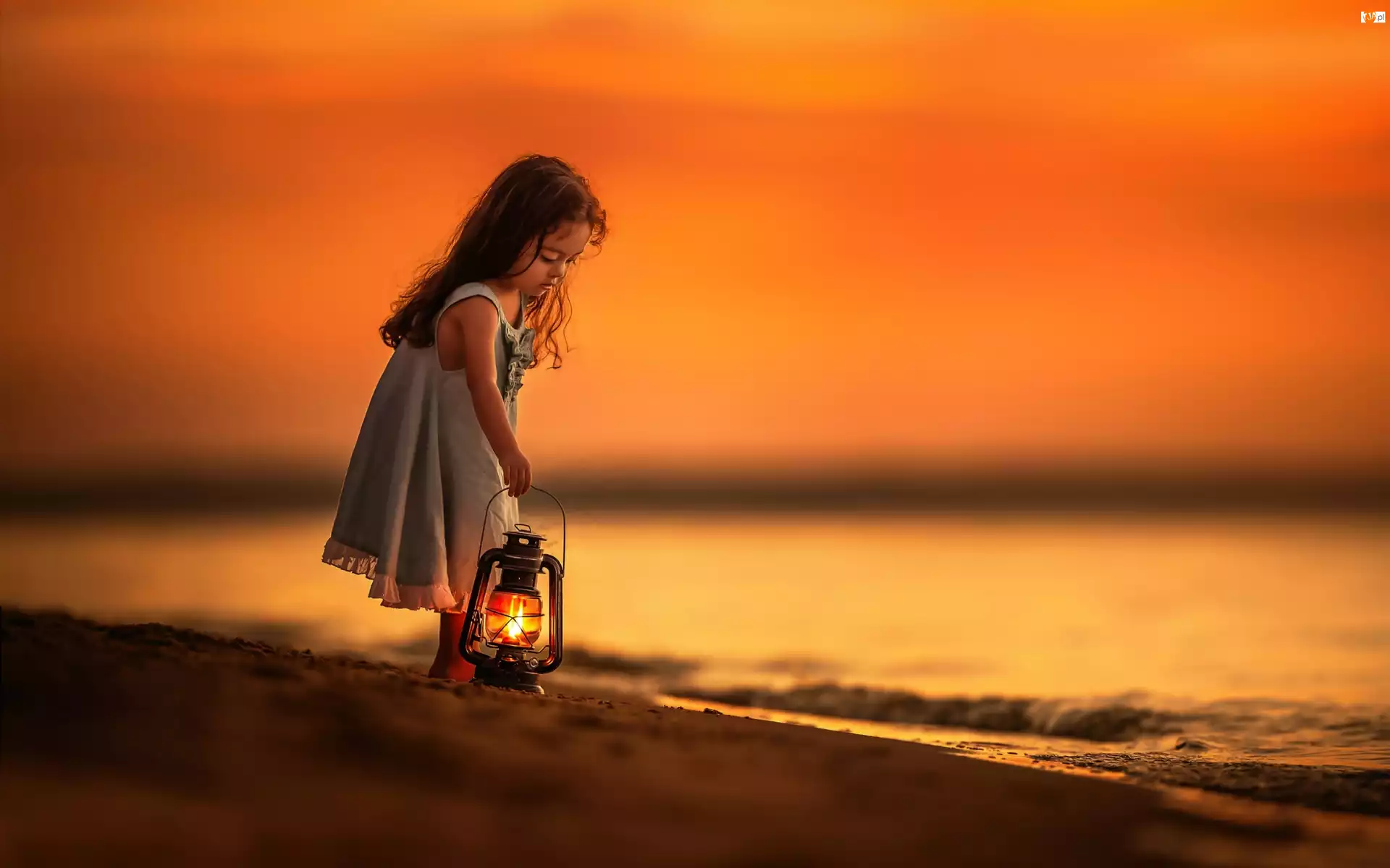 Lampion, Zachód, Dziewczynka, Słońca, Plaża, Morze