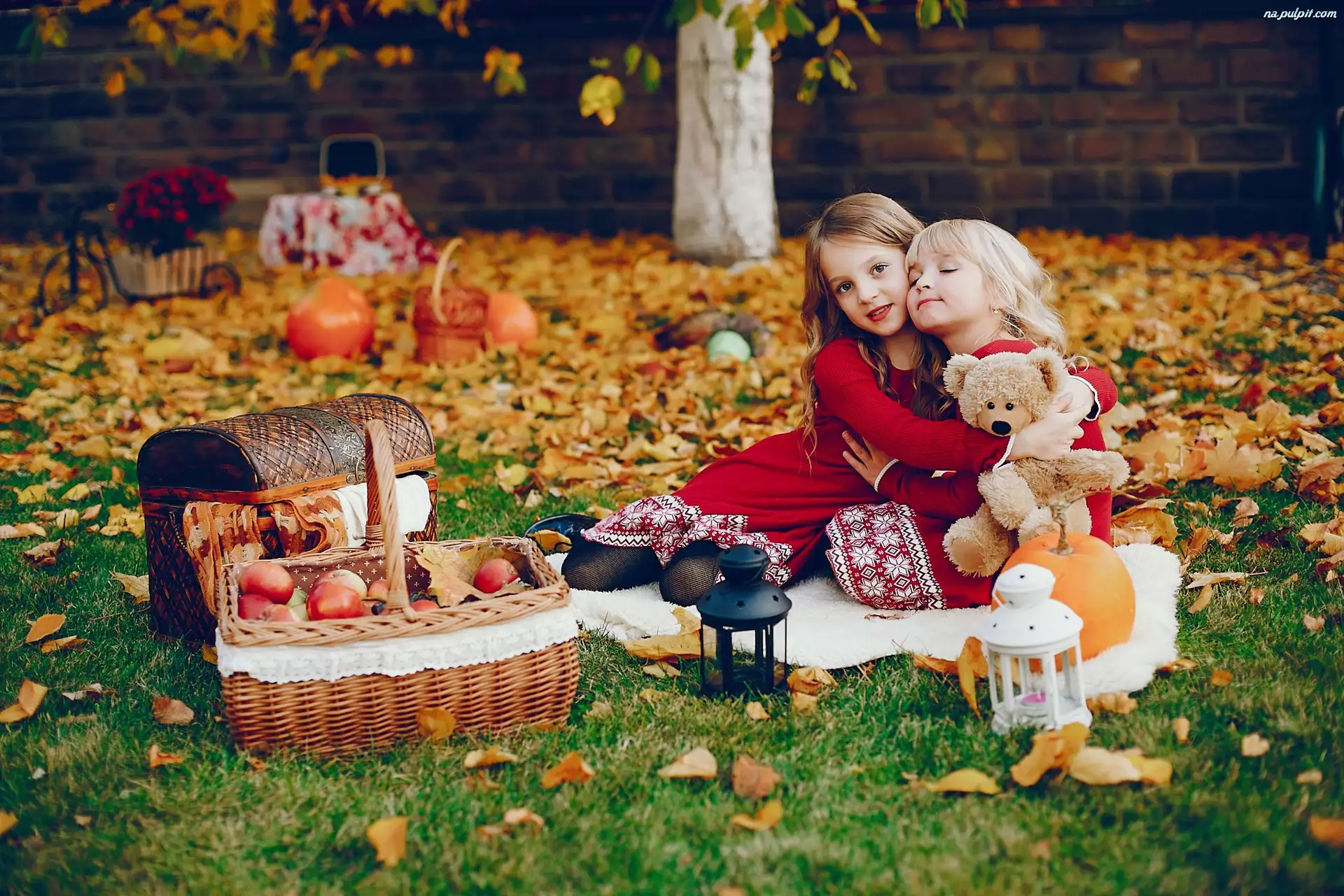 Lampiony, Przytulone, Dynie, Koszyk, Jabłka, Dziewczynki, Liście, Jesień, Skrzynia