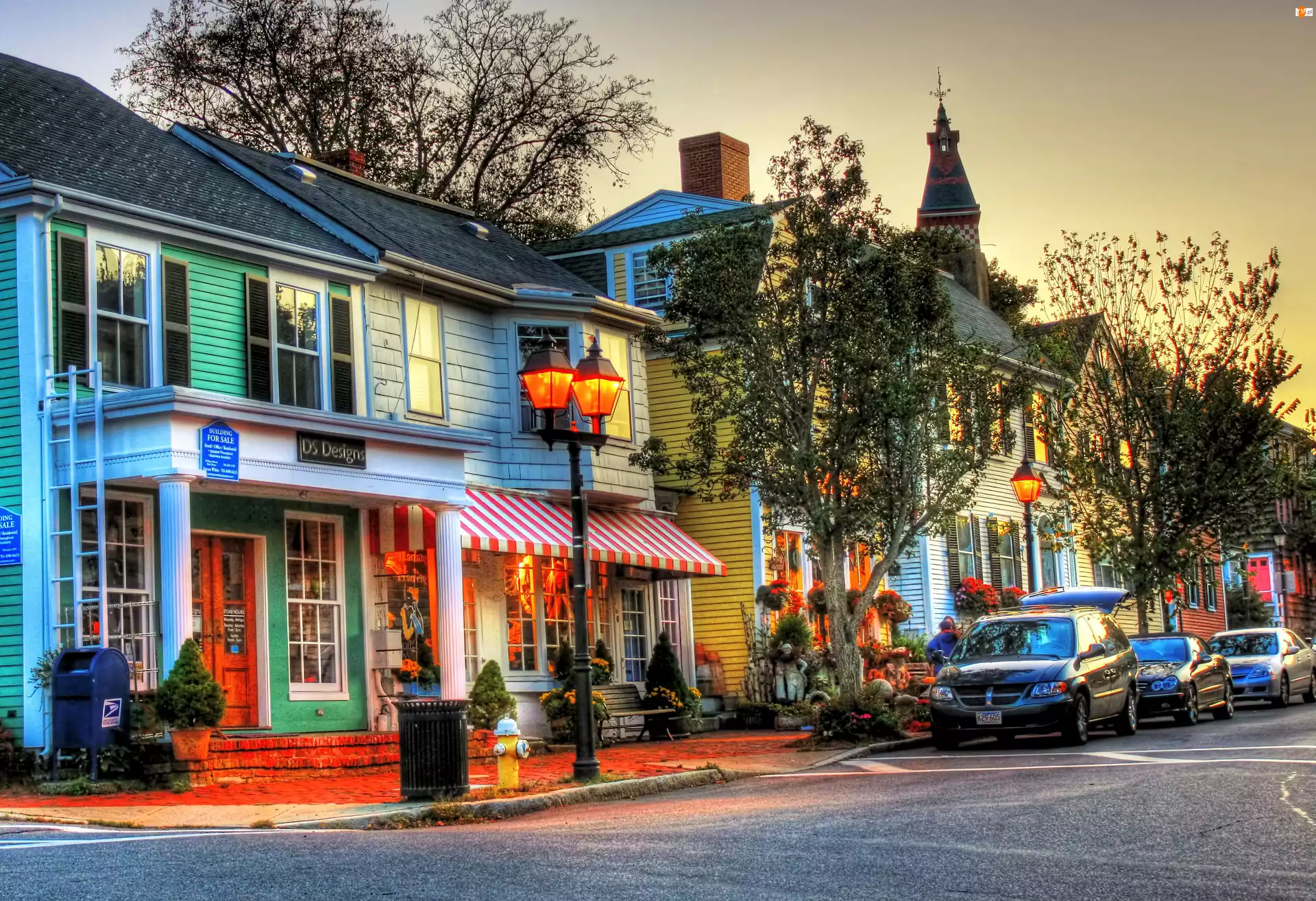 Samochody, Lampy, Domy, Ulica, Drzewa