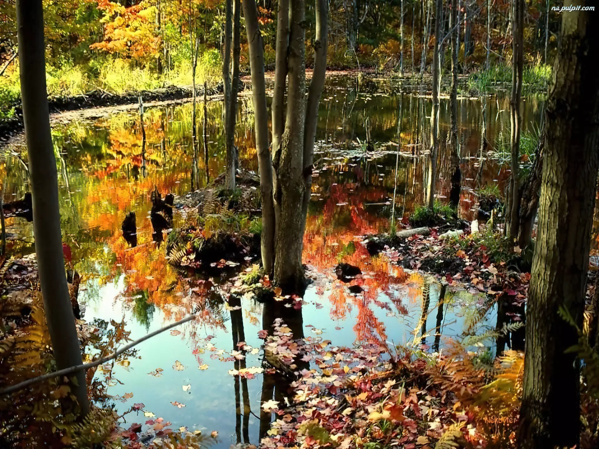 Las, Bagno, Drzewa, Jesień