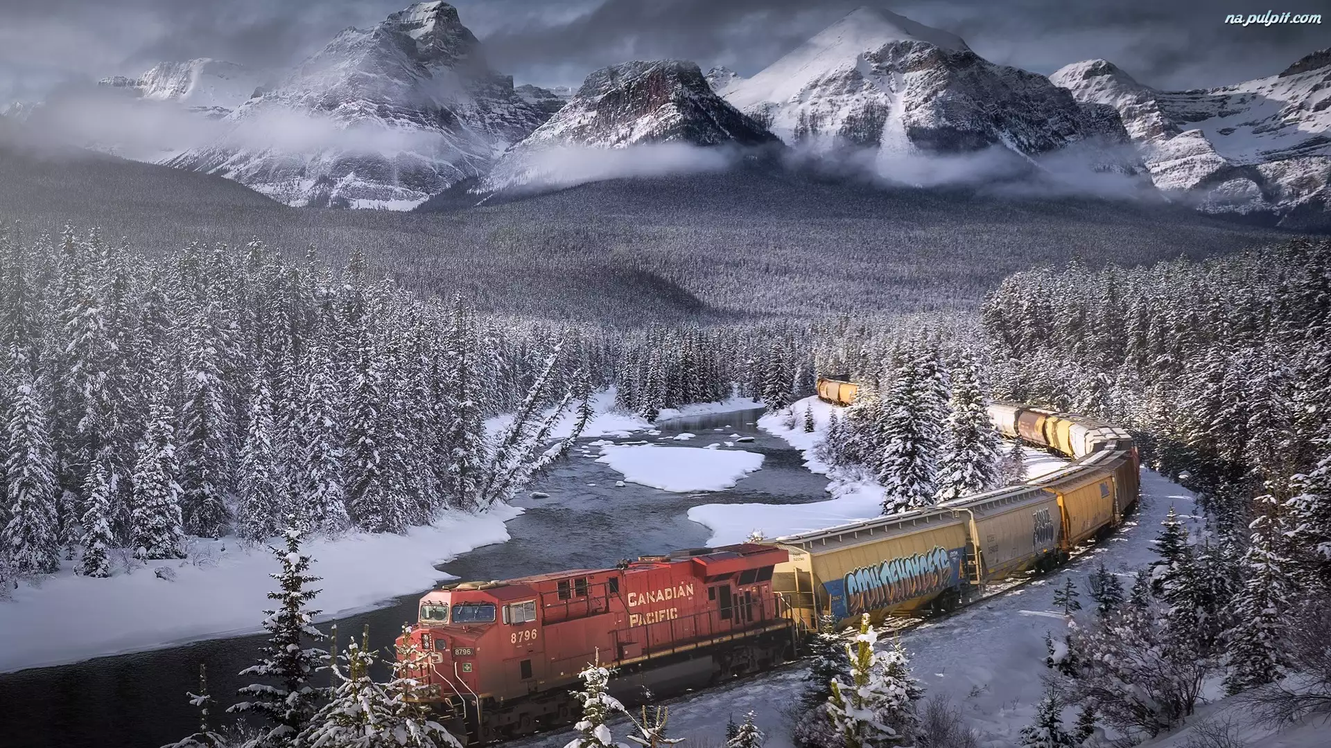 Las, Bow River, Chmury, Park Narodowy Banff, Zima, Alberta, Rzeka, Góry Skaliste, Pociąg, Drzewa, Kanada