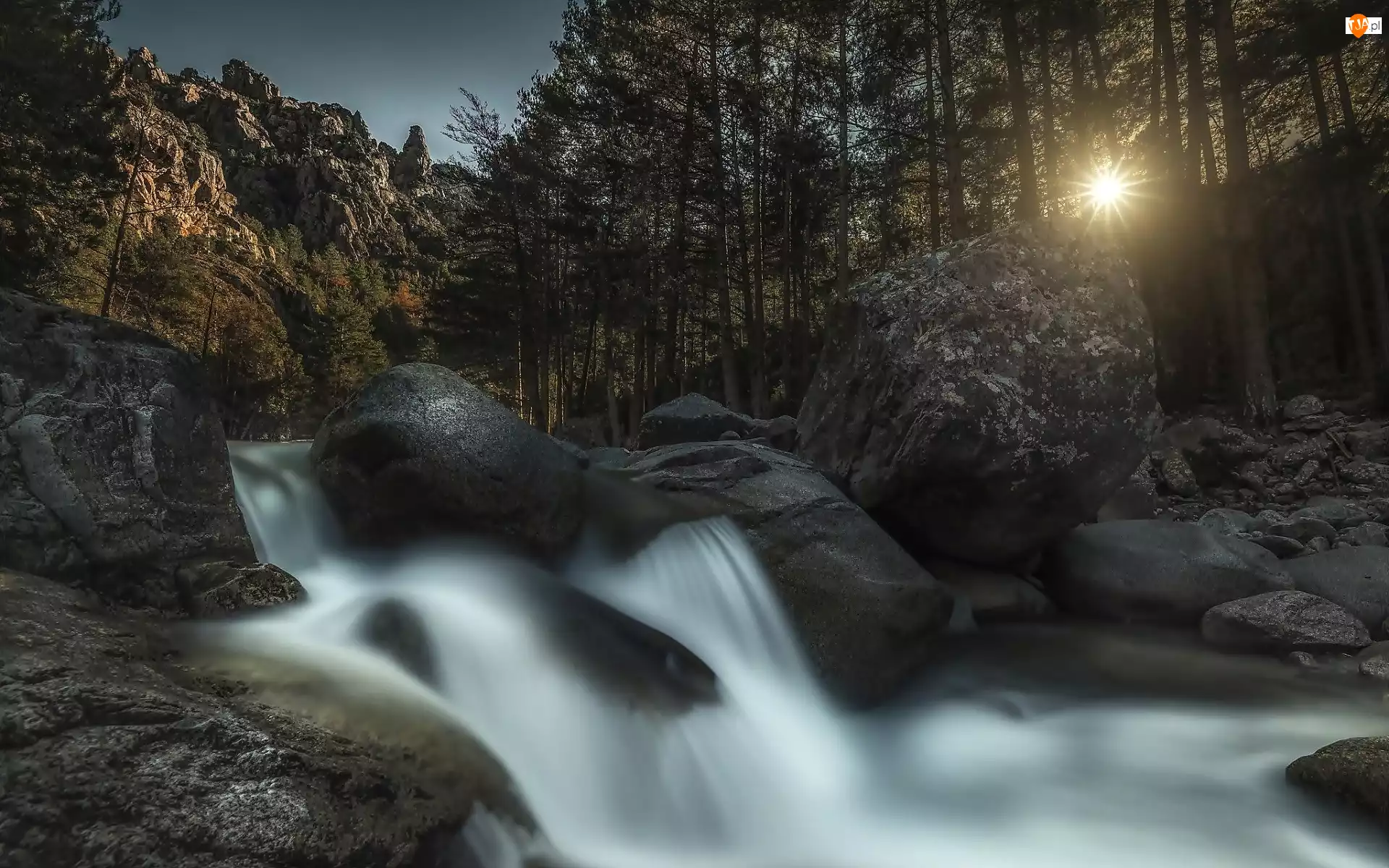 Las, Drzewa, Góry, Przebijające, Wodospad, Słońce, Skały, Świt