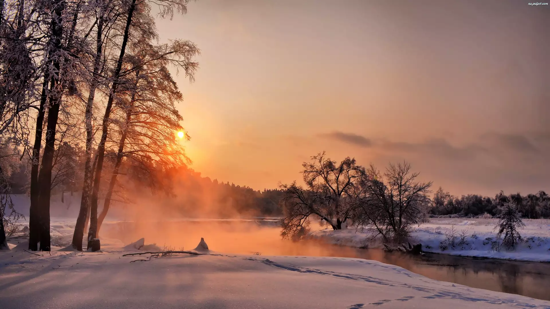 Las, Drzewa, Zima, Mgła, Świt, Rzeka