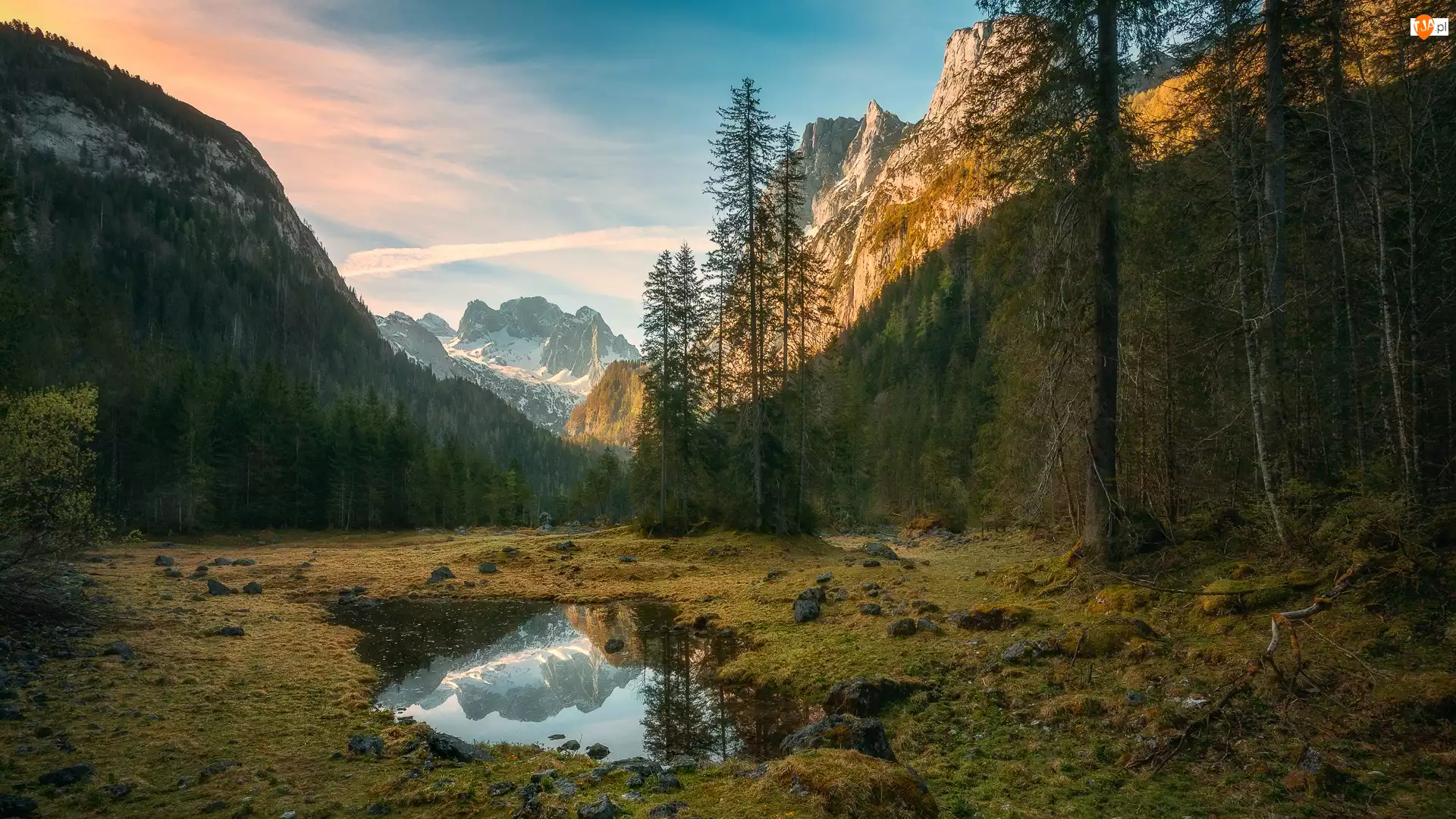 Las, Góry, Kałuża, Wschód słońca, Drzewa, Kamienie