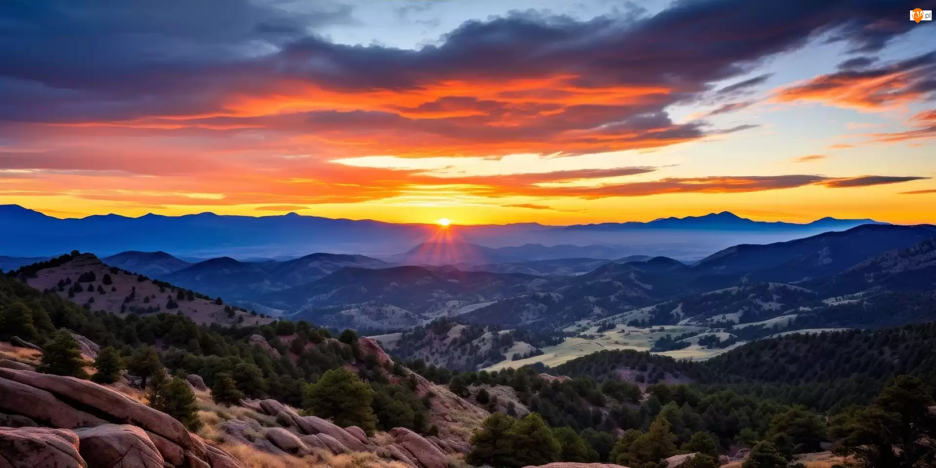 Las, Góry, Niebo, Zachód słońca, Drzewa, Chmur