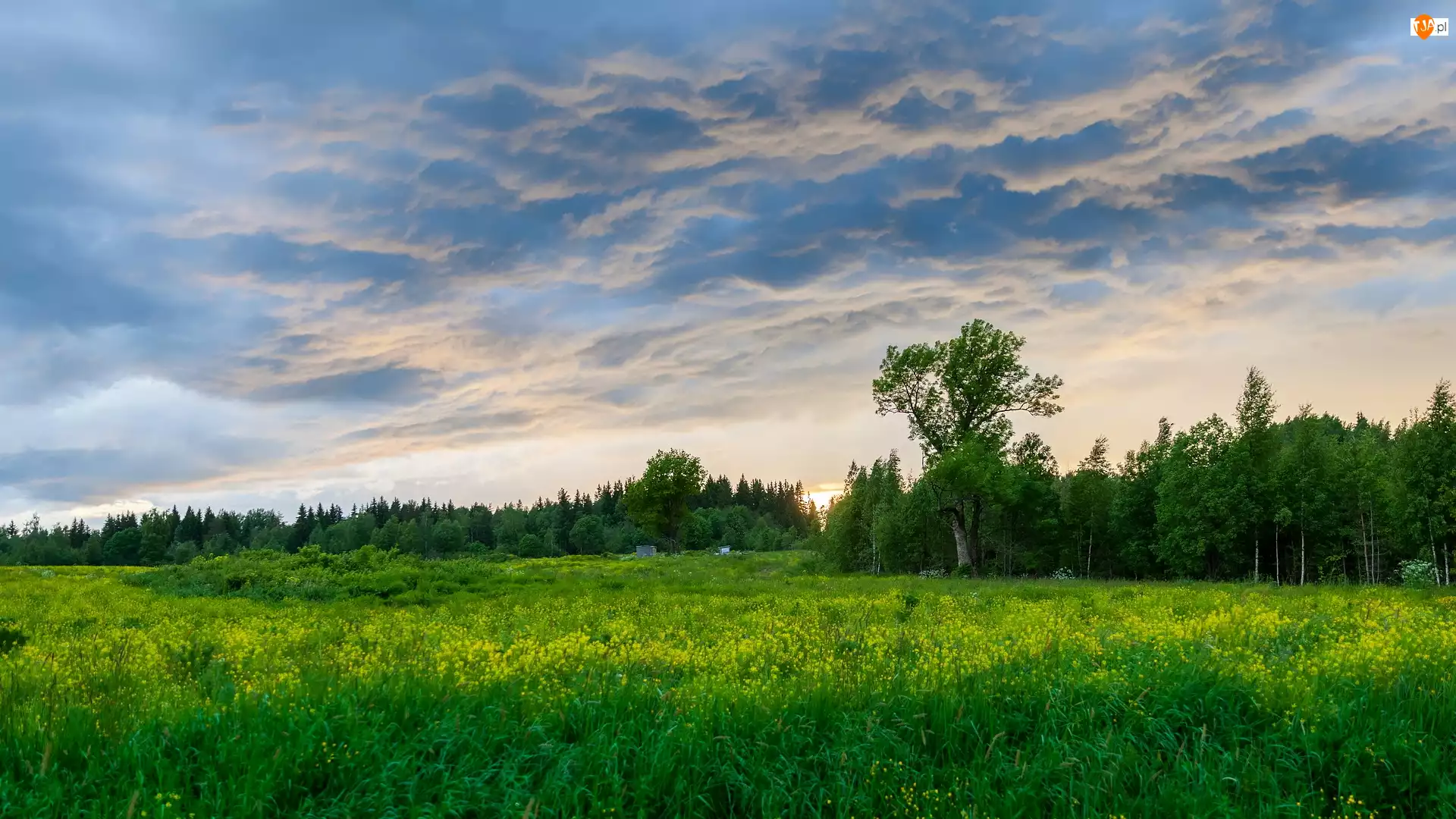 Las, Łąka, Zielona, Chmury, Drzewa, Trawa