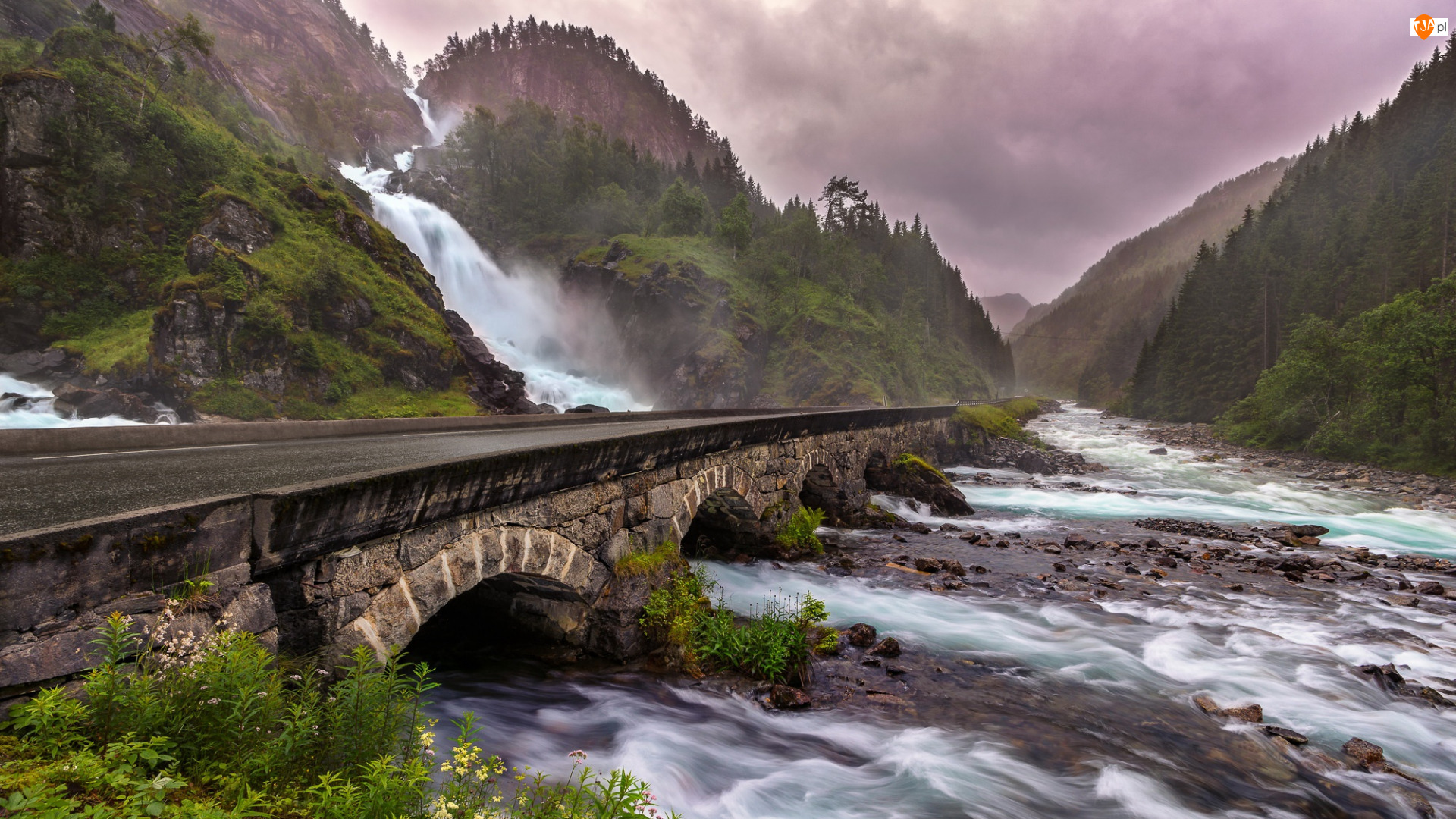 Las, Kamienny, Skały, Norwegia, Drzewa, Wodospad Latefossen, Droga, Góry, Most, Rzeka Gronsdalslona, Kamienie, Gmina Odda