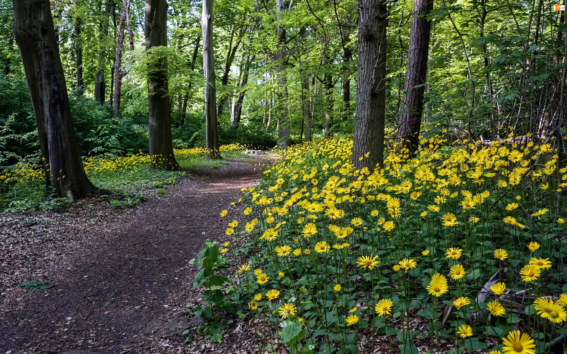 Las, Kwiaty, Drzewa, Droga