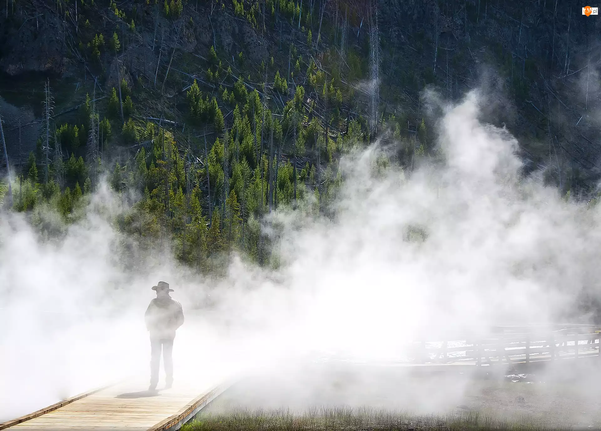 Mężczyzna, Las, Mgła, Mostek