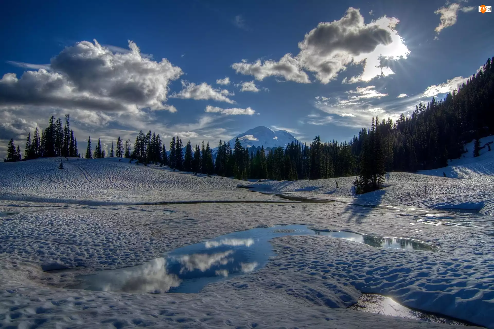 Las, Park Narodowy Mount Rainier, Zima, USA, Jezioro Tipsoo, Promienie Słońca