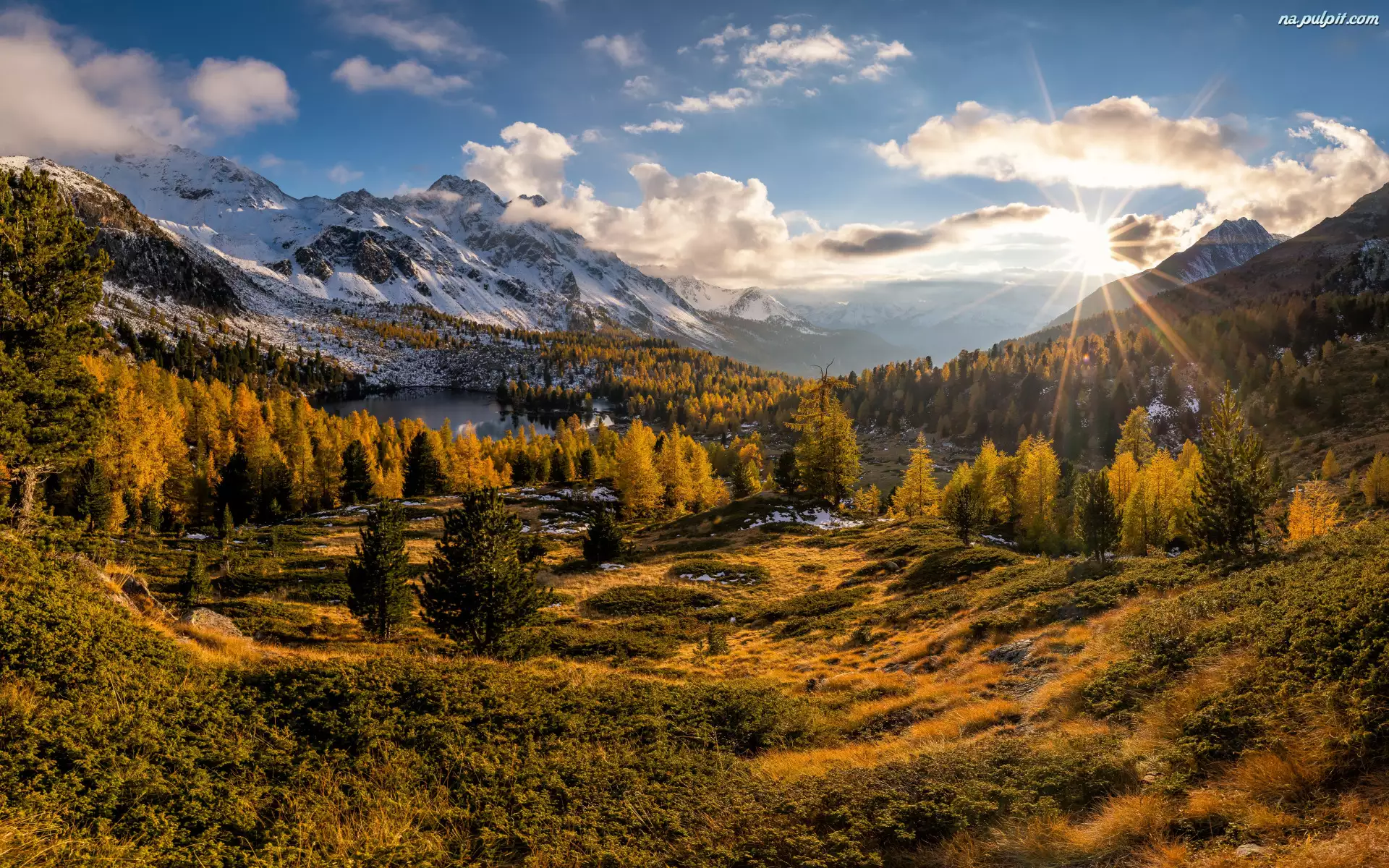 Las, Roślinność, Dolina, Promienie, Góry, Valle di Campo, Drzewa, Jesień, Słońca, Alpy, Szwajcaria