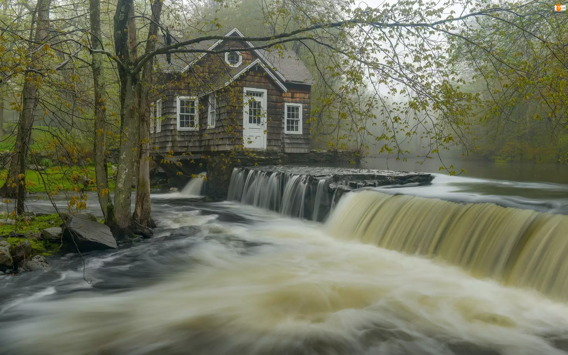 Las, Rzeka, Mgła, Wodospad, Dom