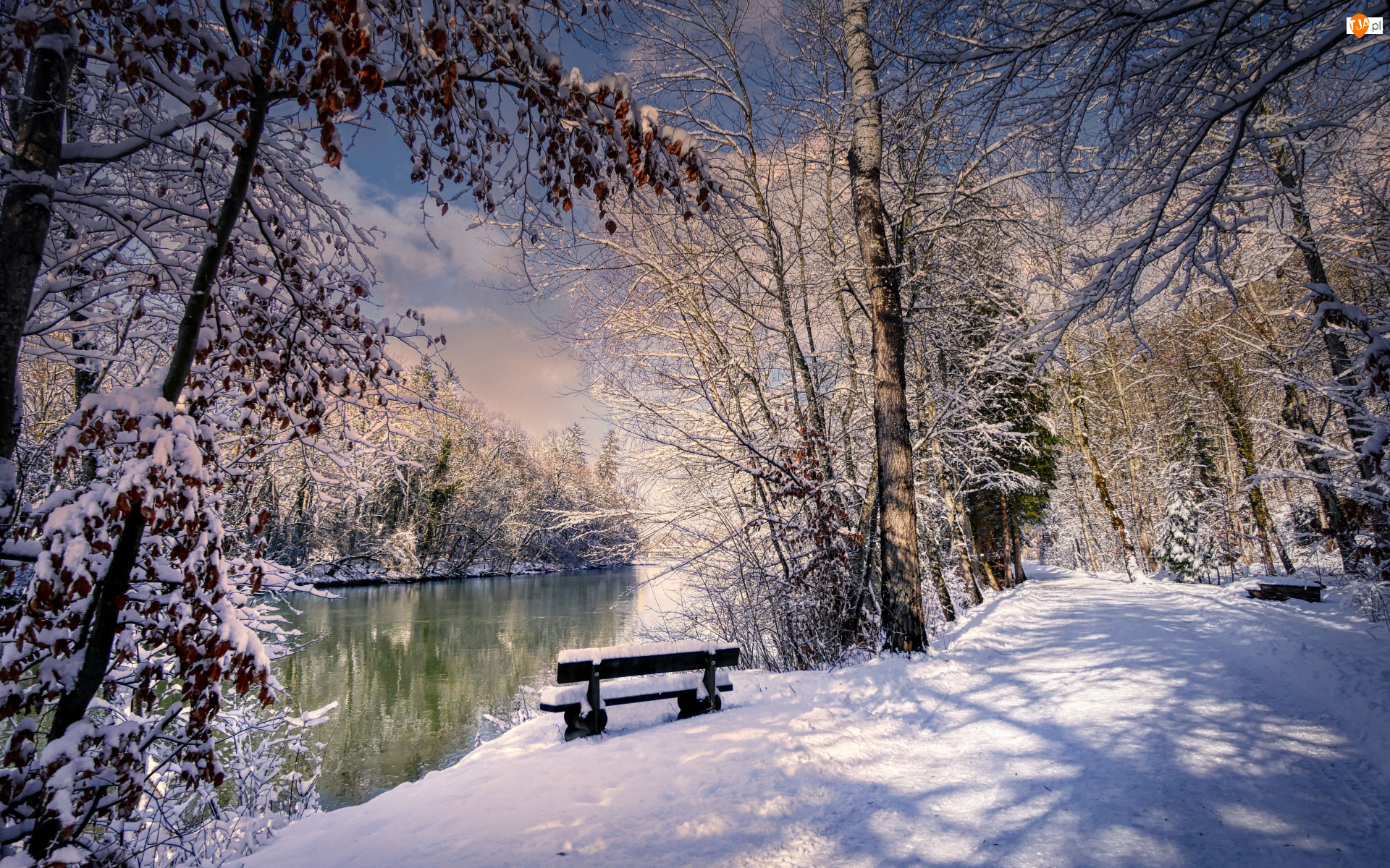 Las, Śnieg, Ławka, Zima, Rzeka, Droga, Drzewa
