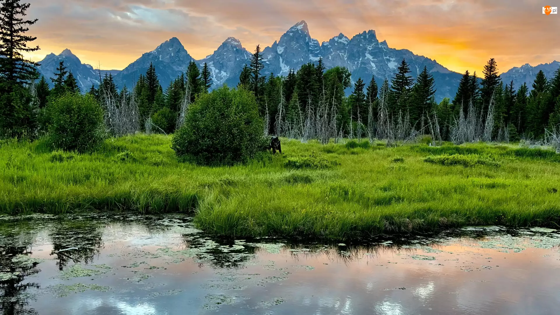 Las, Stany Zjednoczone, Góry, Drzewa, Wyoming, Rzeka, Zachód słońca, Park Narodowy Grand Teton