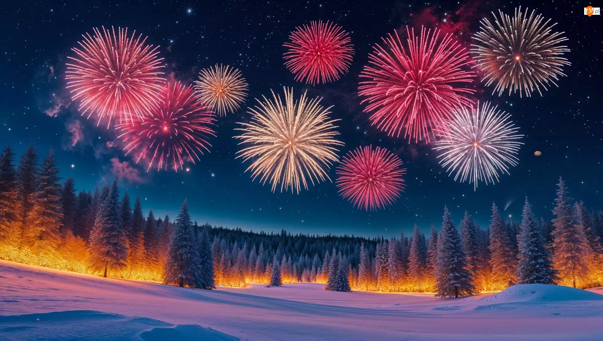 Las, Sylwester, Drzewa, Grafika, Zima, Fajerwerki