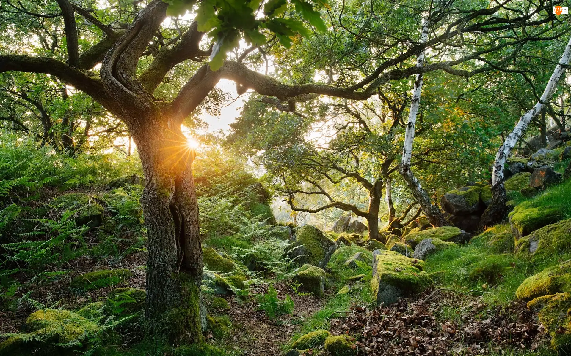 Drzewa, Las, Lato, Paprocie, Promienie słońca, Kamienie