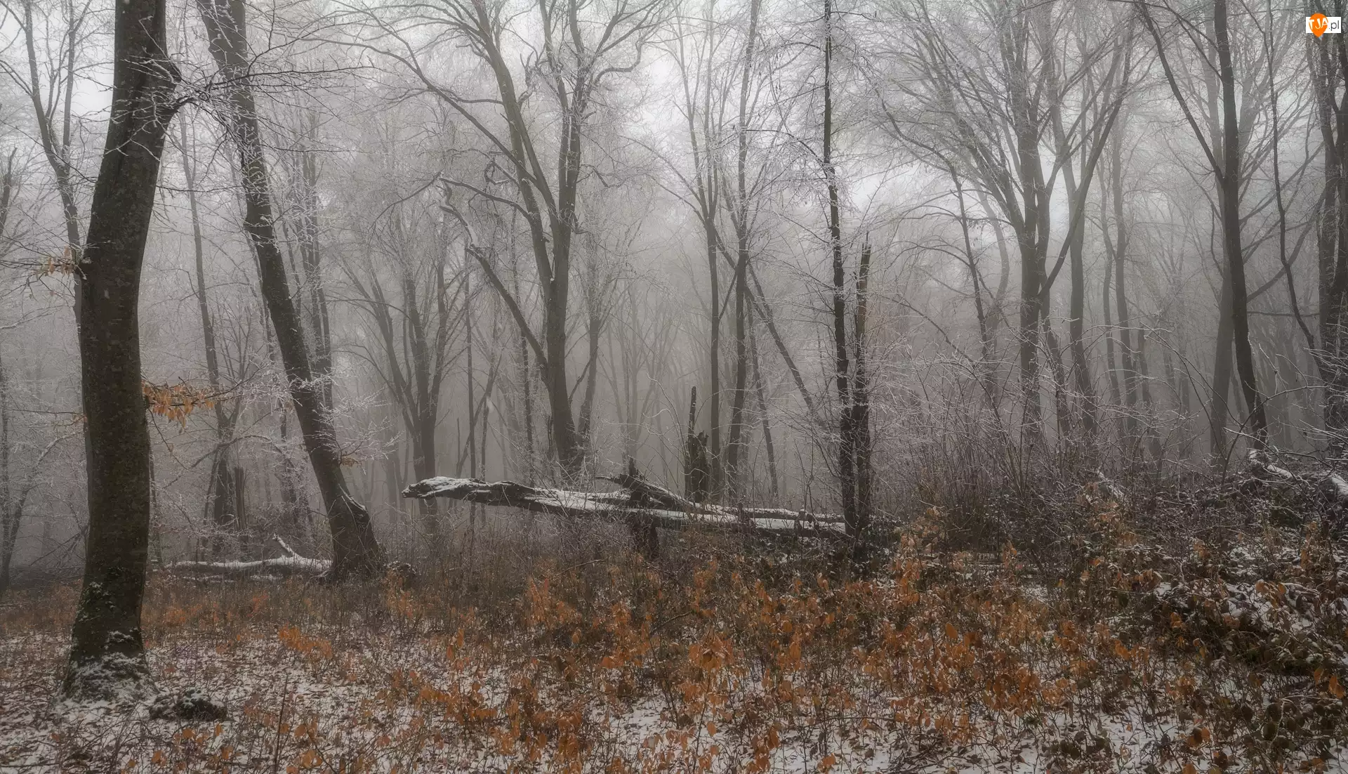Drzewa, Zima, Mgła, Liście, Las, Opadłe