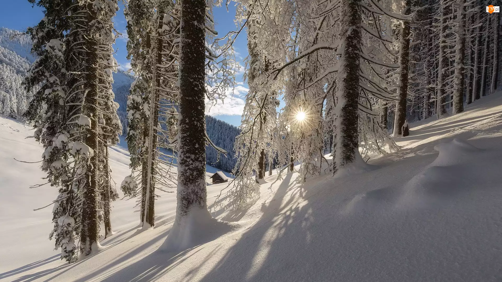 Las, Zima, Drzewa, Dom, Ośnieżone, Promienie sł