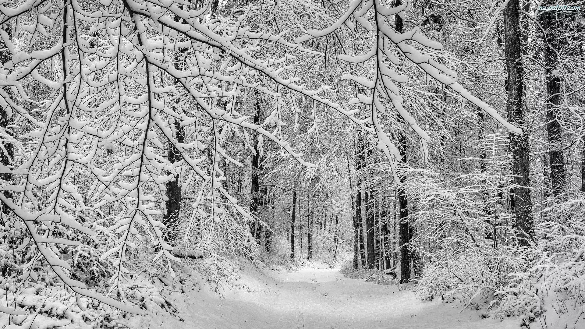 Las, Zima, Ośnieżone, Gałęzie, Droga, Drzewa