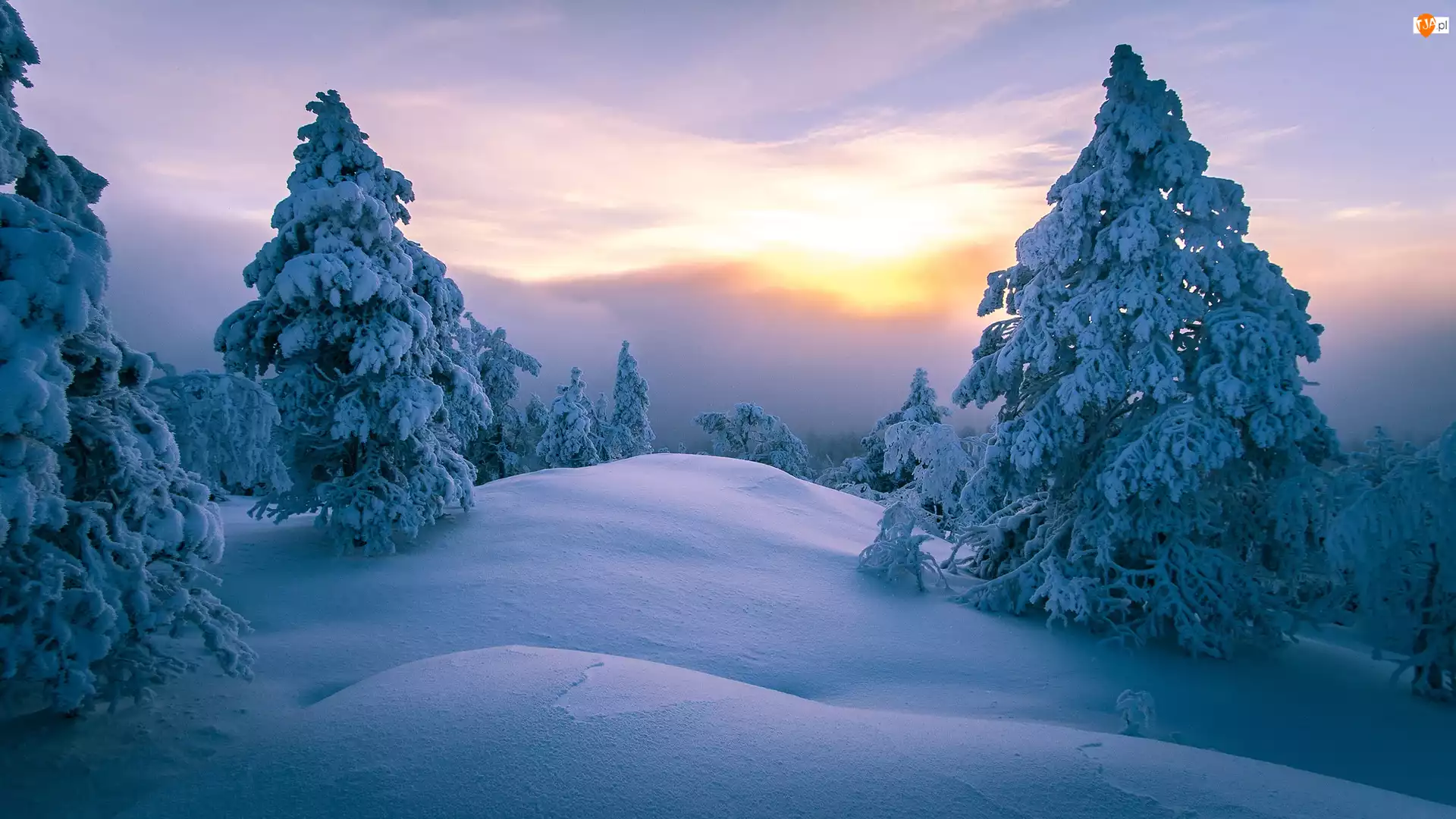 Las, Zima, Śnieg, Zachód słońca, Drzewa, Zaspy