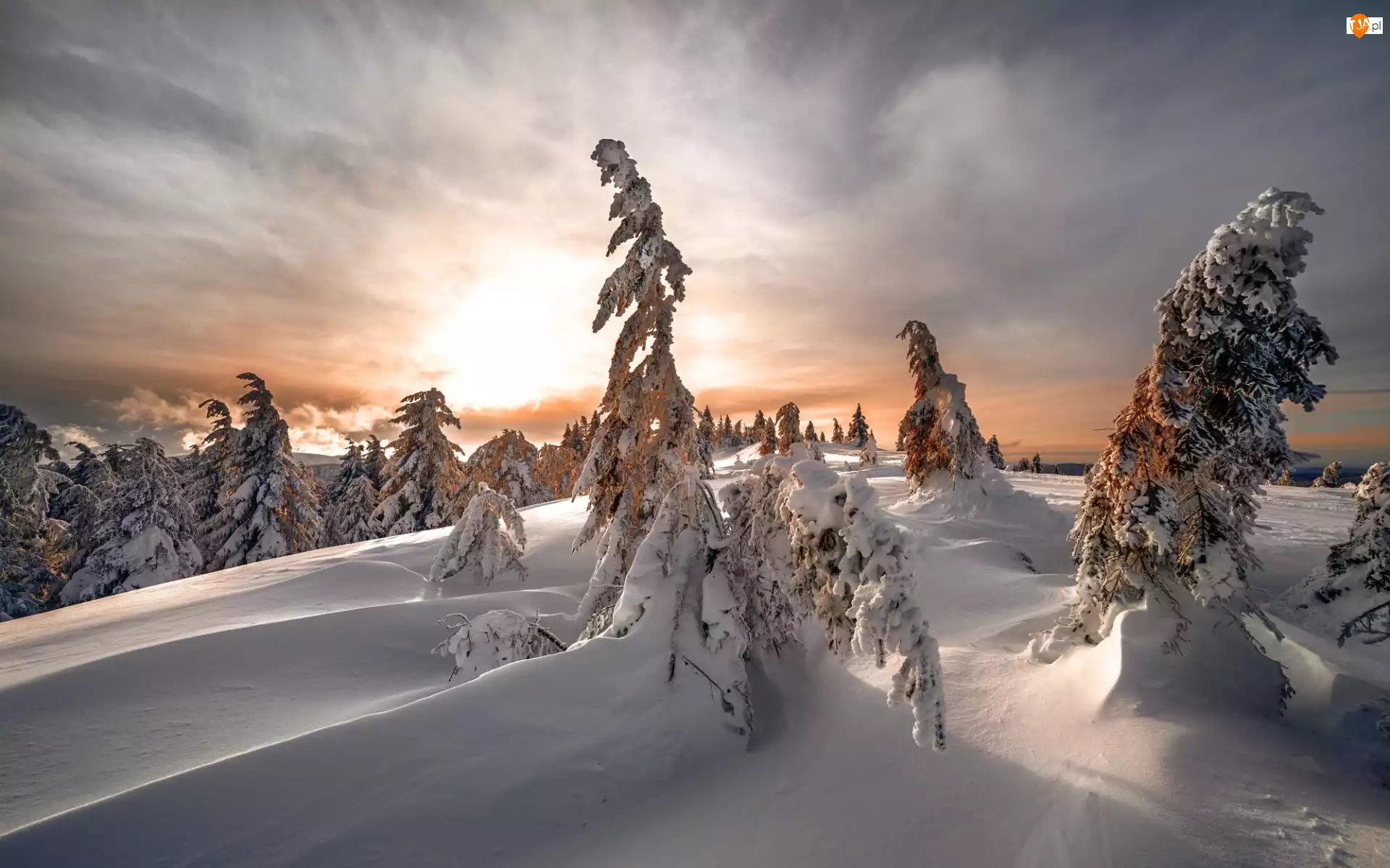 Las, Zima, Śnieg, Zaspy, Drzewa, Wzgórze