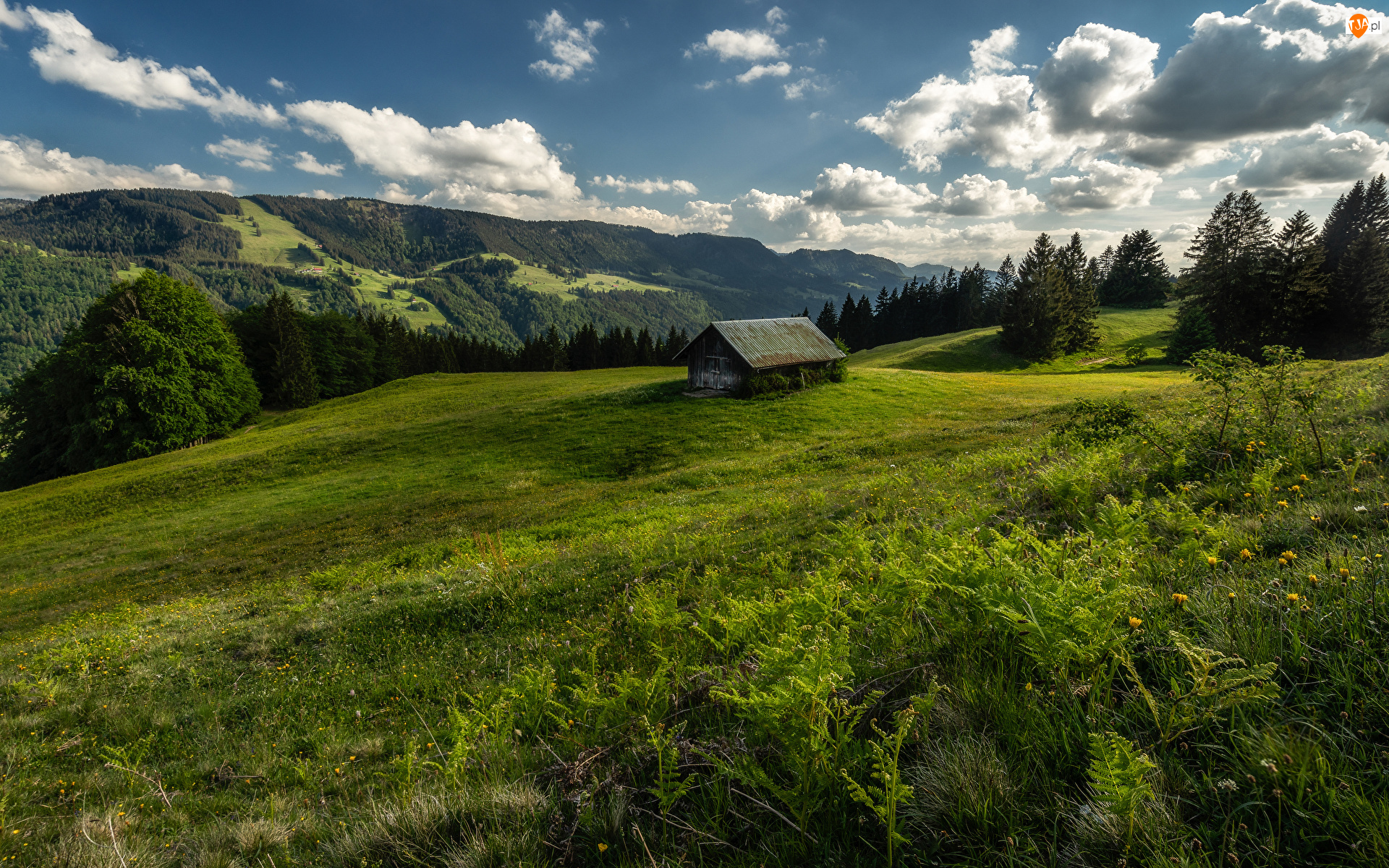 Lasy, Drzewa, Chmury, Wzgórze, Dom, Trawa, Łąka