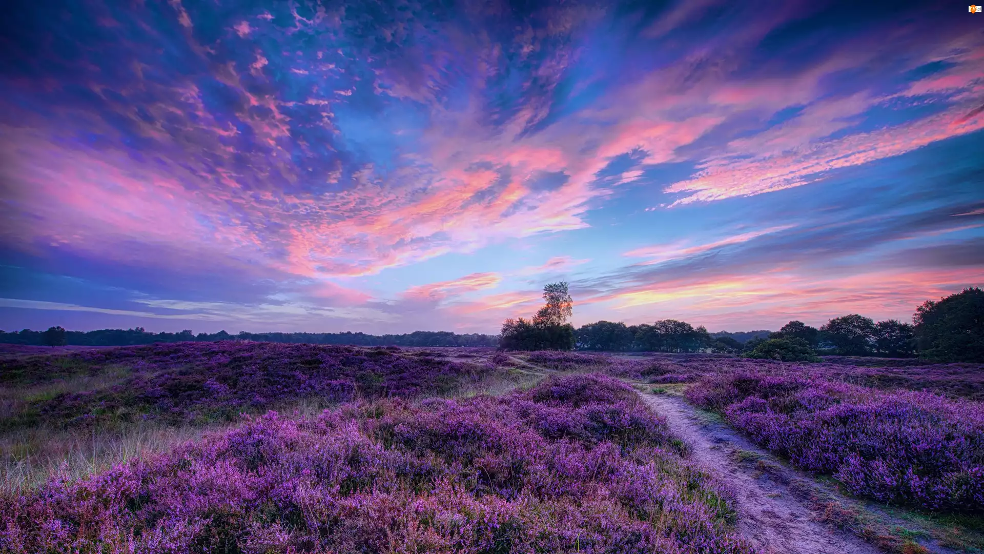 Lasy, Drzewa, Ścieżka, Zachód, Pole, Słońca, Wrzosy, Piękny