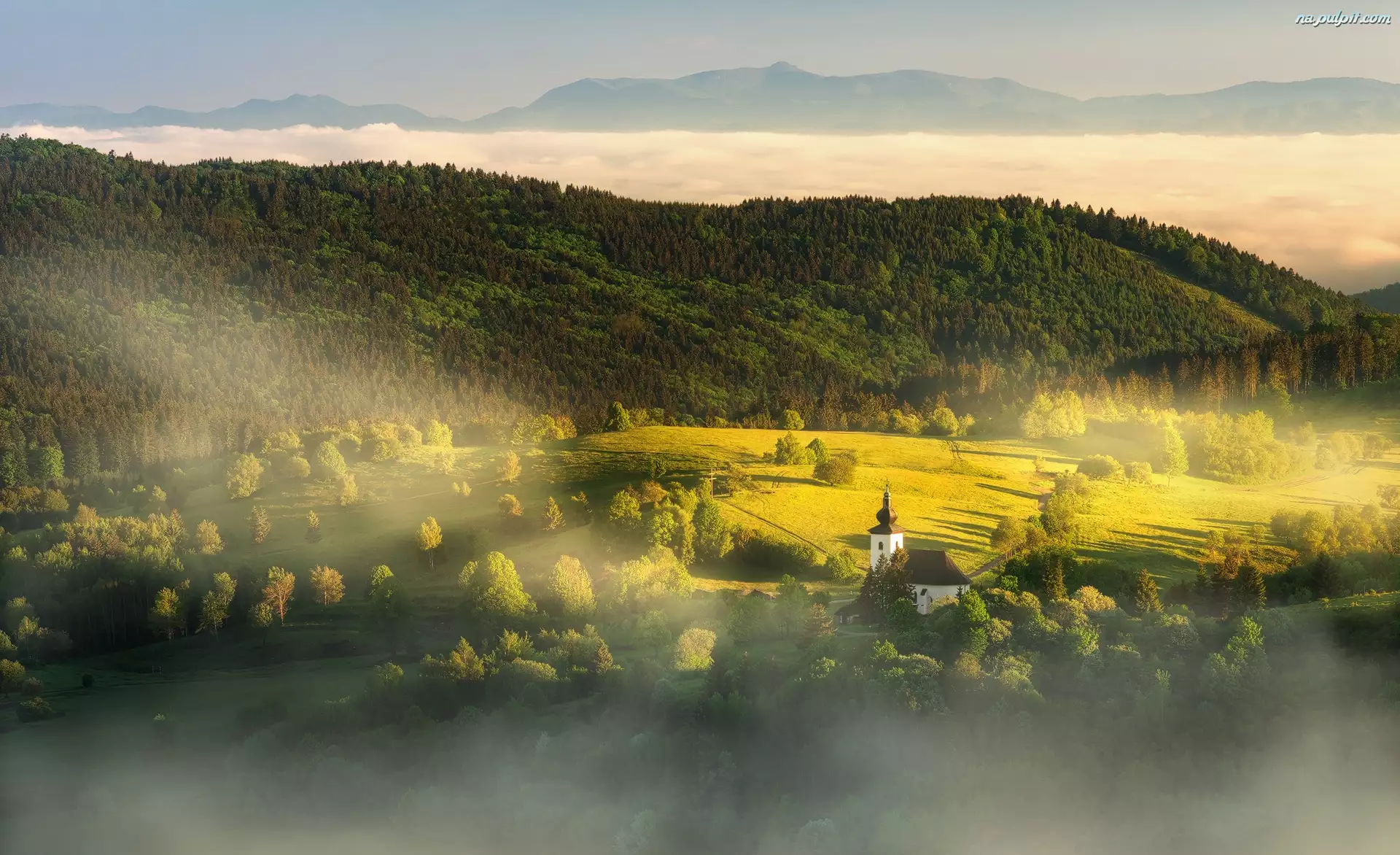 Lasy, Góry, Mgła, Droga, Dolina, Kościół