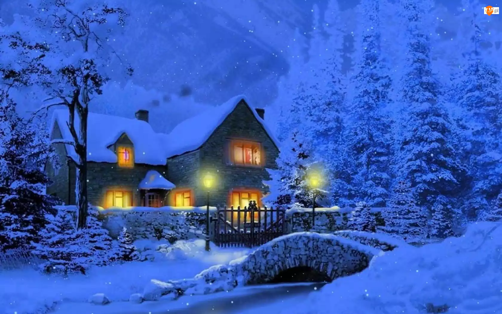 Lasy, Góry, Rzeczka, Zima, Dom, Most