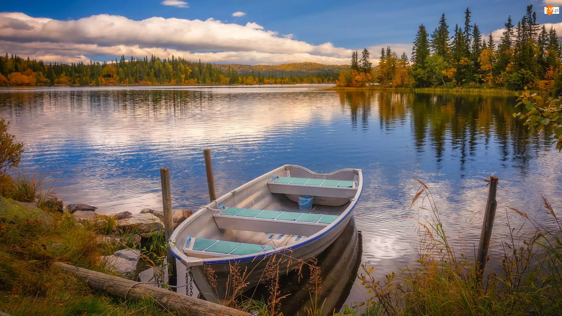 Lasy, Łódka, Jezioro, Jesień, Brzeg
