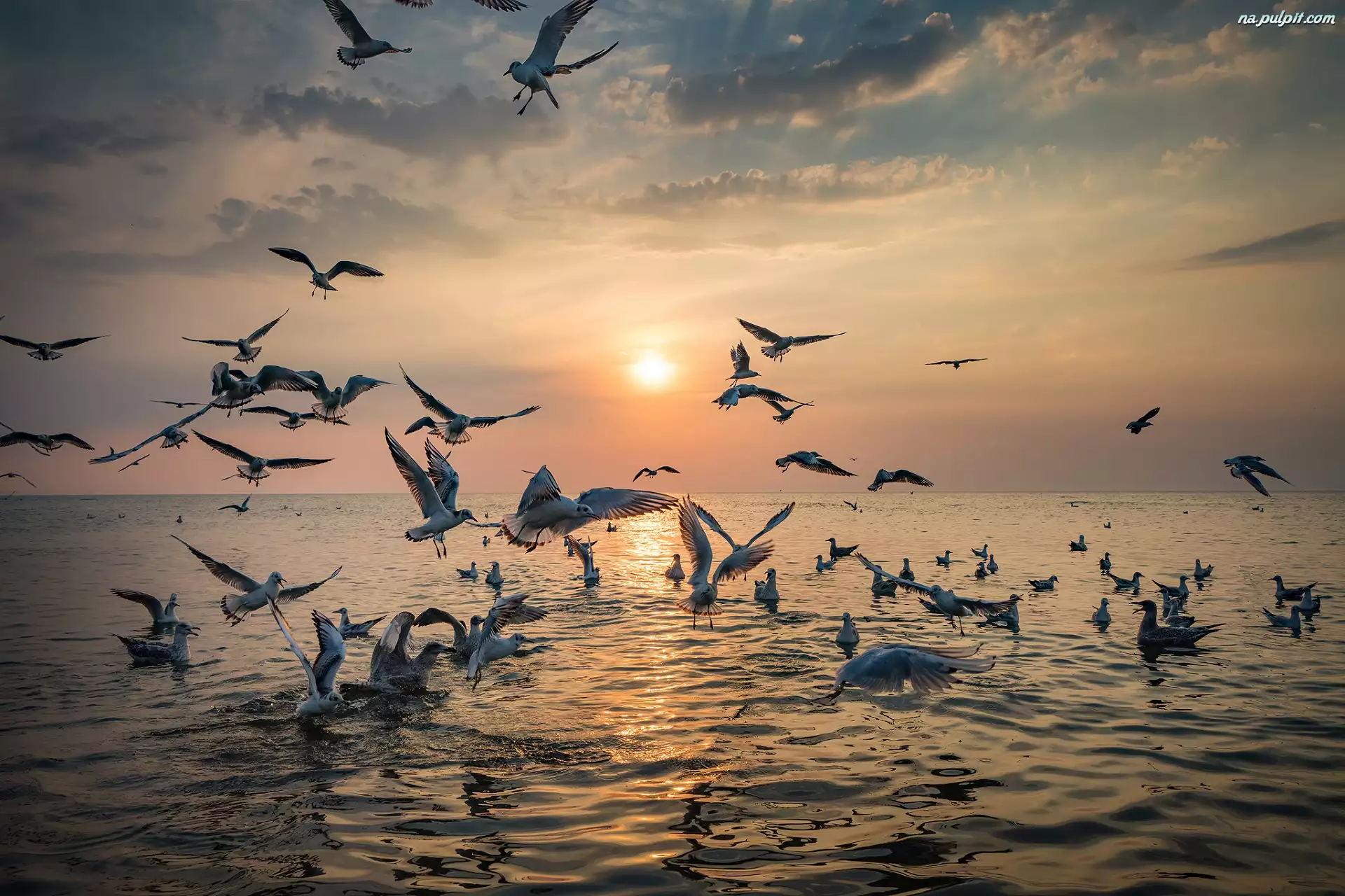 Zachód słońca, Morze, Mewy