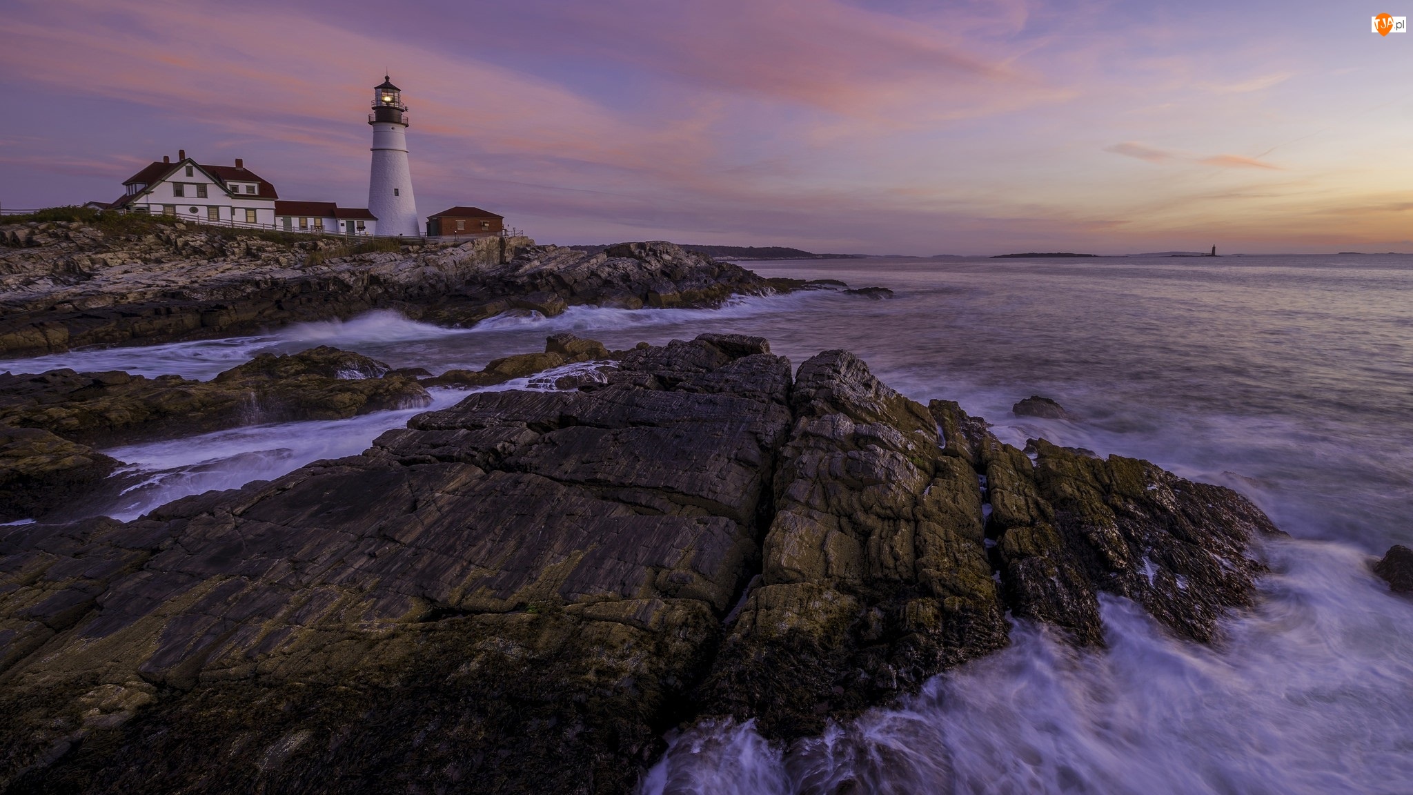 Skały, Latarnia morska Portland Head Light, Stan Maine, Morze, Zatoka Casco, Stany Zjednoczone, Zachód słońca, Cape Elizabeth