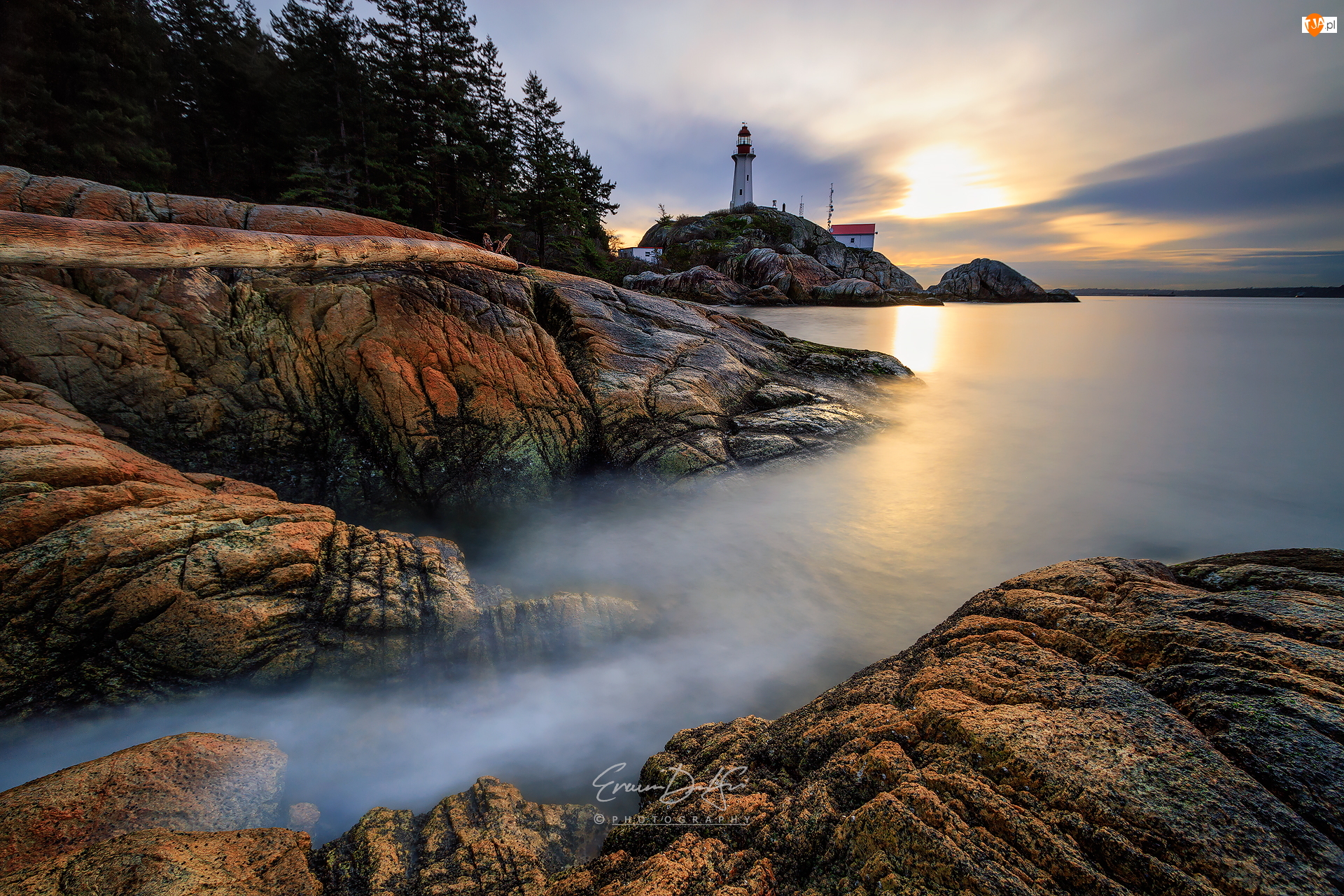 Drzewa, Wschód słońca, Kanada, Skały, Vancouver, Cieśnina Strait of Georgia, Latarnia morska Point Atkinson