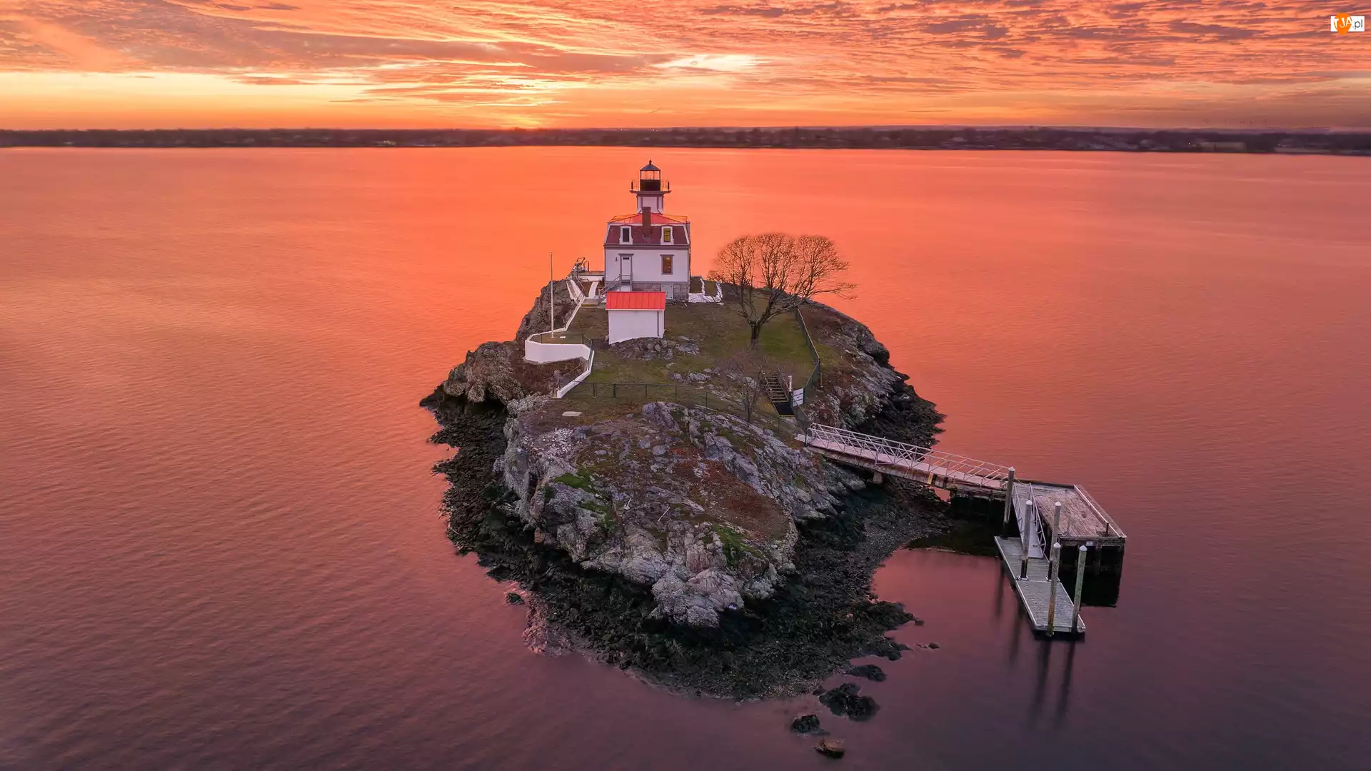Zachód słońca, Nowa Anglia, Pomham Rocks Light, Skały, Latarnia morska, Rhode Island, Wyspa, Stany Zjednoczone, Rzeka Providence