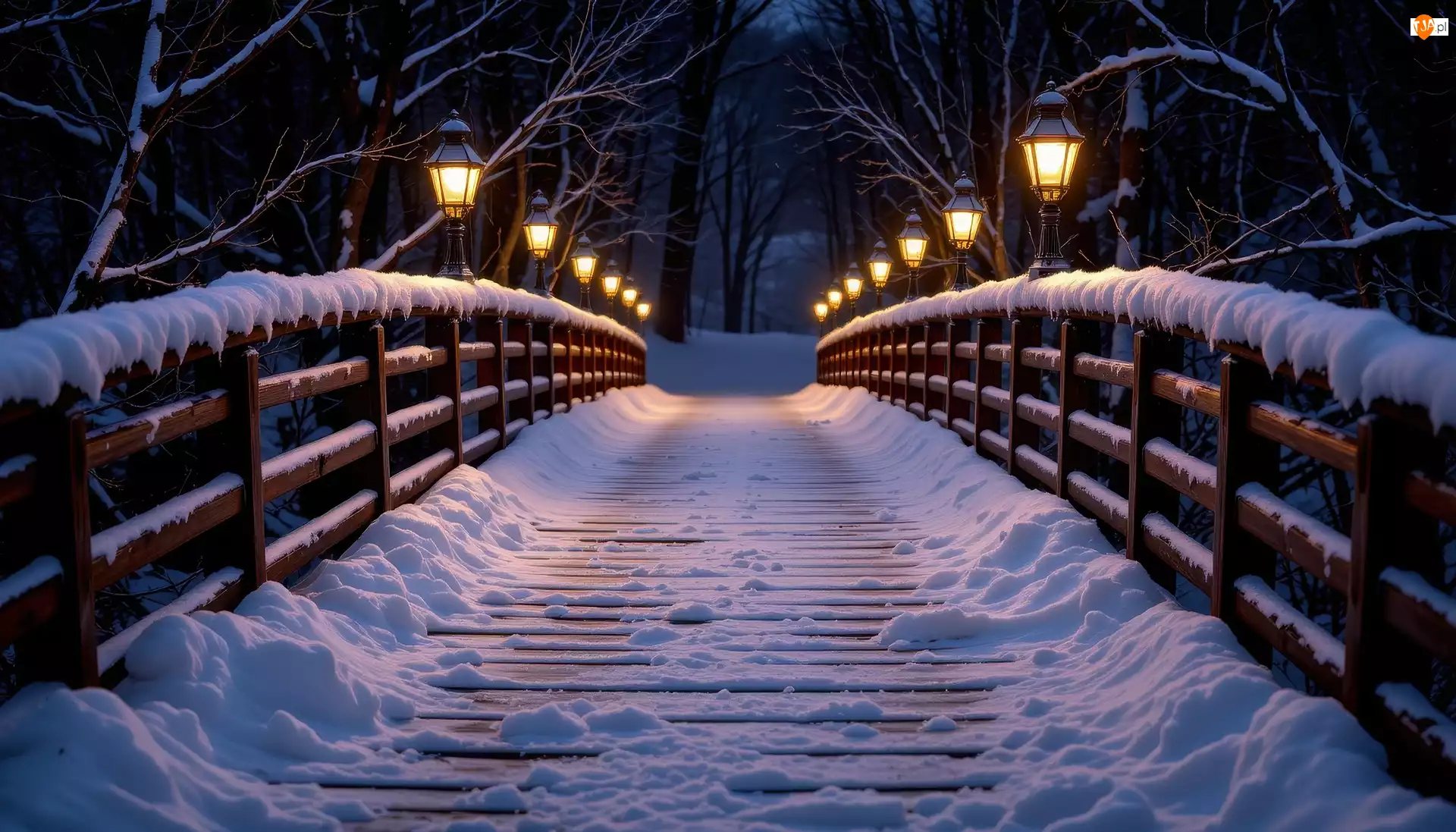 Latarnie, Grafika AI, Most, Ośnieżony, Zima