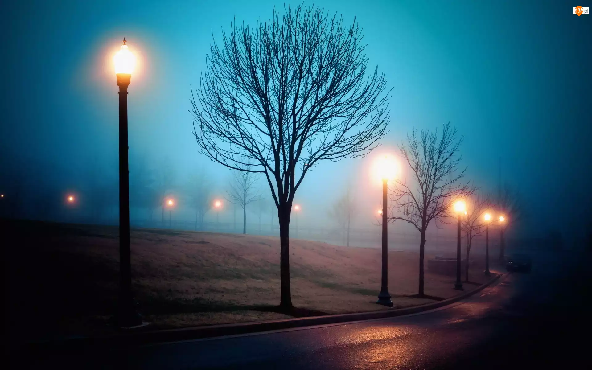 Latarnie, Mgła, Droga, Jesień, Samochód, Drzewa